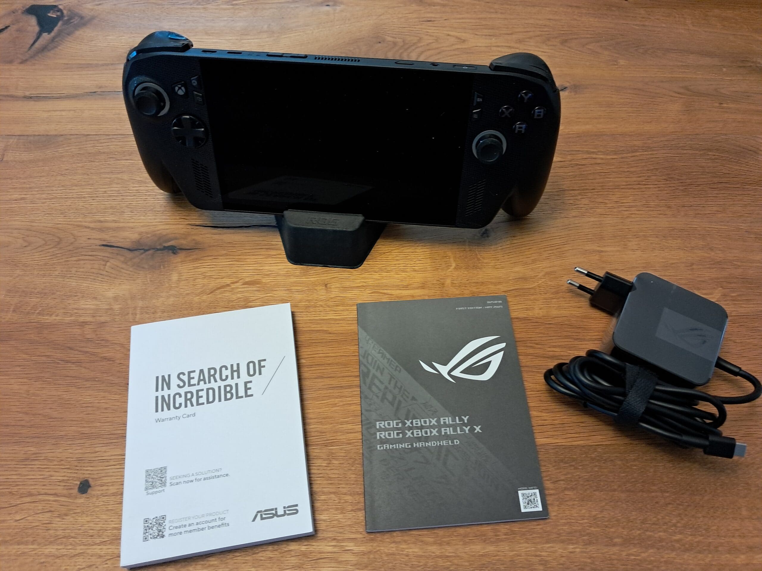 Dann ist noch ein simpler Standfuß, um den ROG Xbox Ally X hineinzustellen – ohne irgendwelche Extrafunktionen und auch nicht sonderlich schwer/hochwertig. Die 100 Seiten starke Anleitung ist nur deshalb so dick, weil sie in unzähligen Sprachen ist. Der deutsche Teil besteht aus rund 3 sinnvollen Seiten mit einer Übersicht über die Funktionen der Vorder- und Rückseite des Gerätes. Zusätzlich sorgt noch ein fast 250 Seiten (!) dickes Garantie-Heftchen für ein wenig Gewicht in der Packung. Wird das Gerät, abgesehen vom Betriebssystem, eigentlich mit zusätzlicher Software ausgeliefert? Ein Aktivierungscode für das eine oder andere Game (von Microsoft) wäre nett gewesen, aber ein 3-Monats Abo für den Game Pass Premium von Microsoft ist auch nicht schlecht! Damit habt ihr jedenfalls schon einmal hunderte Spiele zur Auswahl, die ihr dann drei Monate lang nach Herzenslust spielen könnt. Danach könnt ihr euch ja entscheiden, ob ihr das Abo verlängern wollt oder eure Spiel lieber aus anderer Quelle bezieht.