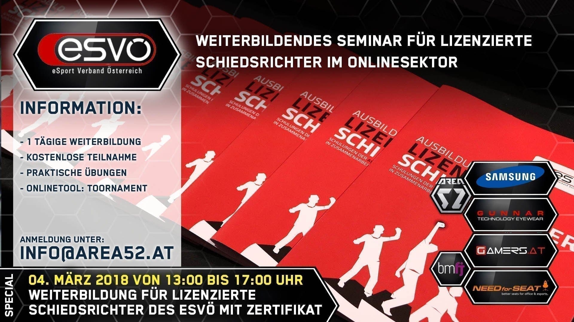 Der elektronische Sportverband Österreichs ist vielschichtig tätig, einer dieser Aktivitäten umfasst die Ausbildung und den Einsatz von „lizensierten Schiedsrichtern“. Mit dem Schiedsrichterseminar 2.0 in der AREA52 wird auf vorangegangene Schulungen aufgebaut und die Veranstalter widmen sich dem Onlinesektor im Detail.