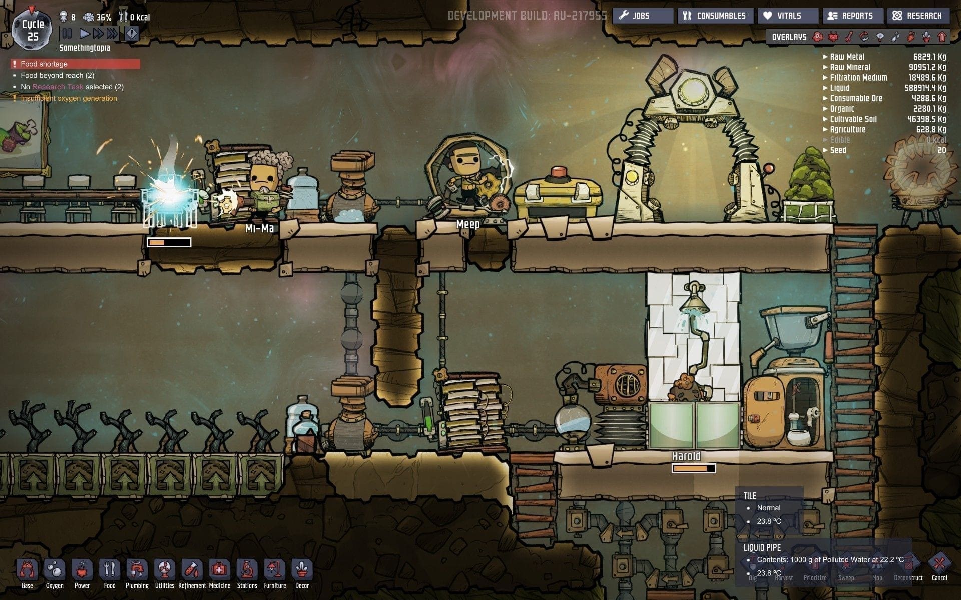 Das Spiel Oxygen Not Included stammt von Klei Entertainment und ist ein herausforderndes Weltraum-Kolonie-Simulationsspiel, bei dem ihr eine Gruppe von Raumfahrern managen müsst, die in einer unterirdischen Asteroidenbasis gestrandet sind. Dabei muss die Kolonie sorgfältig geplant und erweitert werden, damit das Überleben der Bewohner gewährleistet wird. Dazu gehört auch die Verwaltung von Ressourcen wie Sauerstoff, Nahrung, Wasser und Energie sowie die Entsorgung von Abfall und toxischen Gasen. Währenddessen müssen die Spieler:innen auch auf die individuellen Bedürfnisse und Fähigkeiten ihrer Kolonisten achten, um ihre Produktivität und Zufriedenheit sicherzustellen.