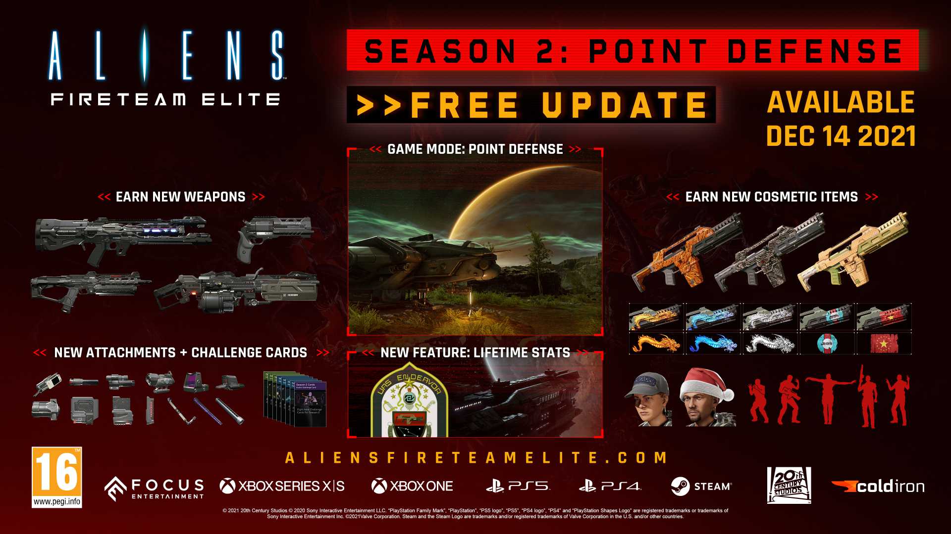 Nachdem im September Season 1: Phalanx veröffentlicht wurde, wird die neue Season kostenlose Items für alle Spieler*innen beinhalten – mitsamt einem neuen Modus der auf den Namen Point Defense hört. Diese schnelle Alternative zum Horde Modus in eine neue Art von Survival Schlachten werfen, bei denen das Team drei strategische Punkte verteidigen, reparieren und halten muss, während die Xenomorph in Wellen angreifen. Spieler*innen können sich verbrauchbare Items kaufen um die Chancengleichheit zu erhöhen. Verwendet werden dafür Punkte, die während der Spielrunden freigeschaltet werden und mit denen man bis zu 20 neue Belohnungen freischalten kann, wenn man alle Schwierigkeitsgrade meistert.