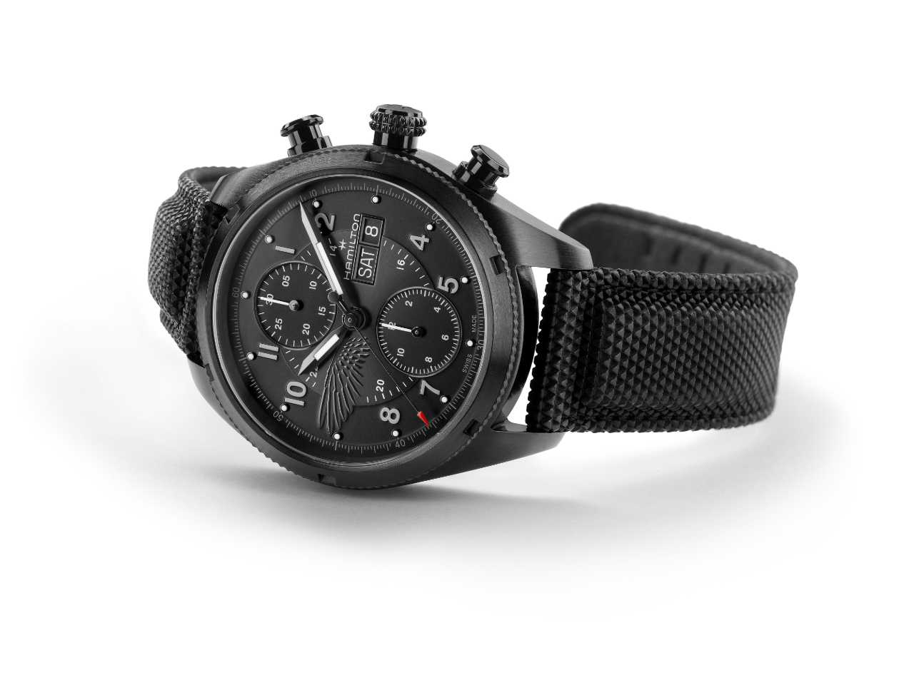 Die von Leon S. Kennedy im Spiel getragene Khaki Field Auto Chrono ist ein einzigartiger Zeitmesser, der robuste Funktionalität mit Ästhetik verbindet. Die Designelemente spielen auf Leons Kampferfahrung an: Die Krone ist dem Knopf eines Scharfschützenfernrohrs nachempfunden, während die Drücker an Patronenhülsen erinnern. Der schwarze Flügel an der 9-Uhr-Position des Zifferblatts und das Emblem auf der Rückseite des Gehäuses sind ein Symbol, das die Gebete für die Gefallenen verkörpert.