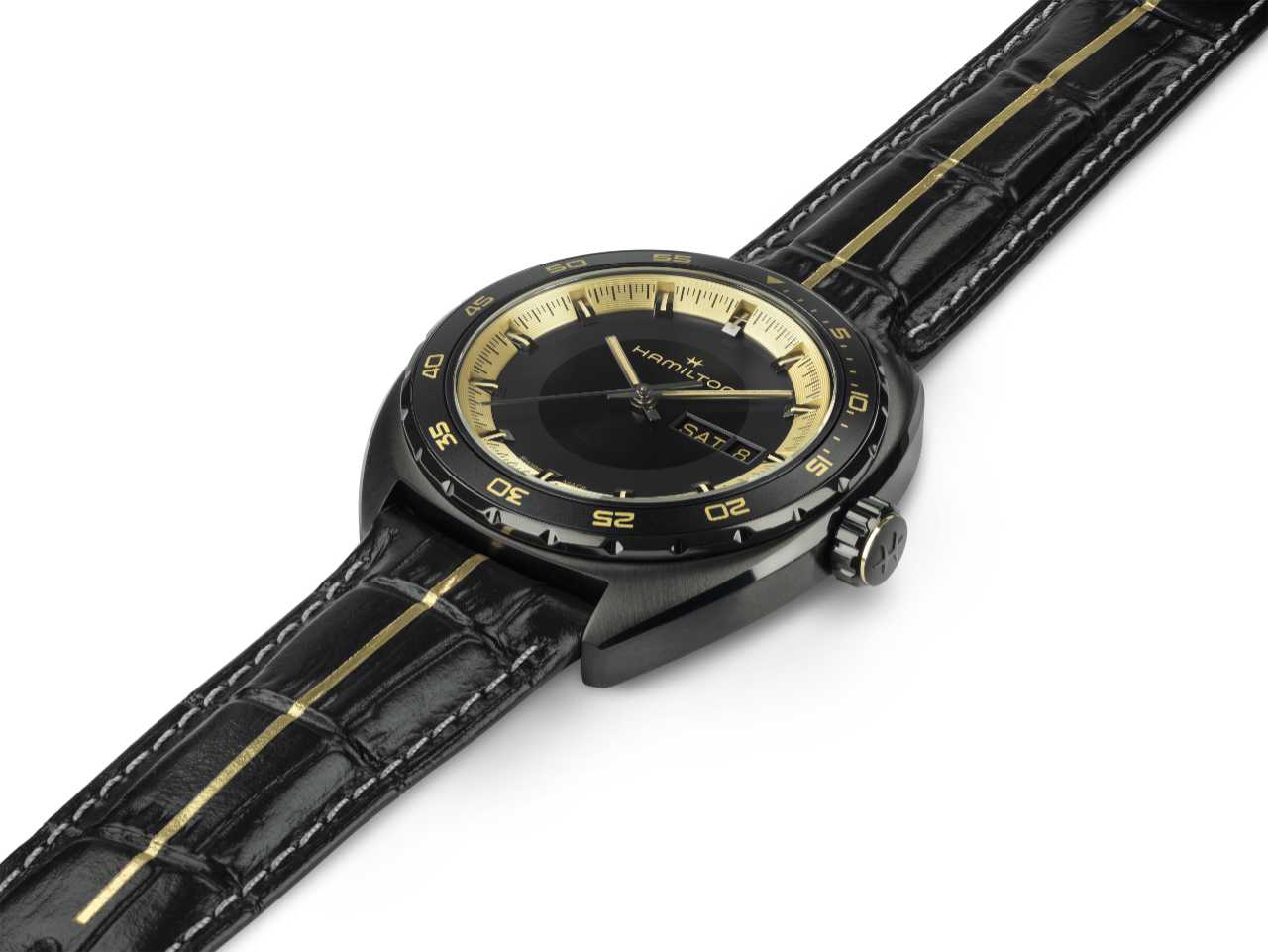 Die kontrastreiche Optik der von Grace Ashcroft getragenen Pan Europ verweist auf Graces Intelligenz und ihren analytischen Scharfsinn. Entlang der Mitte des Armbands verläuft auf schwarzem Hintergrund eine goldene Linie, die Rückseite des Gehäuses ist mit geometrischen Motiven verziert. Die Ziffern auf dem Zifferblatt und der äußere Ring sind ebenfalls in Gold gehalten und lassen einen Kontrast zwischen Gold und Schwarz entstehen, der sowohl Stärke als auch Eleganz verströmt.