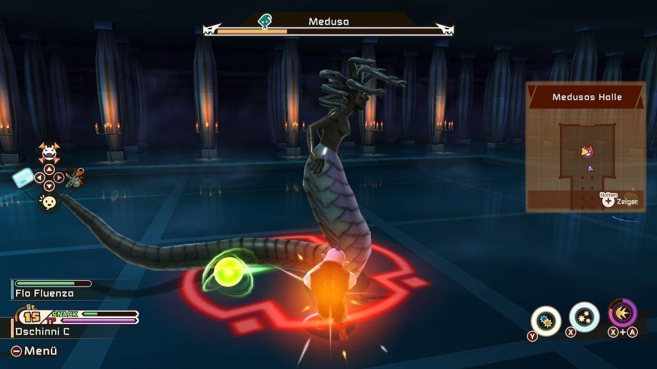Kommen wir aber zum eigentlichen Herzstück des Spiels, dem Dungeon Crawlen. Soweit bekannte Standardkost, wenn auch teils mit anderen Namen: Tränke heilen, Parfüms haben kurzfristige Statuseffekte. Verschiedene Waffen (Jaras) sind unterschiedlich schnell und haben unterschiedliche Angriffsmuster. Jede Waffe hat zudem zwei randomisierte Spezialangriffe, ein bis zwei zufällige Bonuskräfte und kann schlussendlich noch als „Töter“ besonders effektiv gegen bestimmte Arten von Monstern/Snacks sein. Niemand muss sich jetzt aber merken, welche Axt gegen Naturwesen und/oder welches Schwert gegen Untote effektiver war. Und auch ob der Eichkater ebenso ein Krieger, wie die Maskierte Melone ist (Antwort: nein), muss nicht auswendig gelernt werden. Hat man gegen den Gegner, den man gerade angreift, eine effektivere Waffe am Jara-Schlüsselbund, wird dies entsprechend angezeigt und mit Druck der Schultertaste wird blitzschnell zur effektiveren Waffe gewechselt.