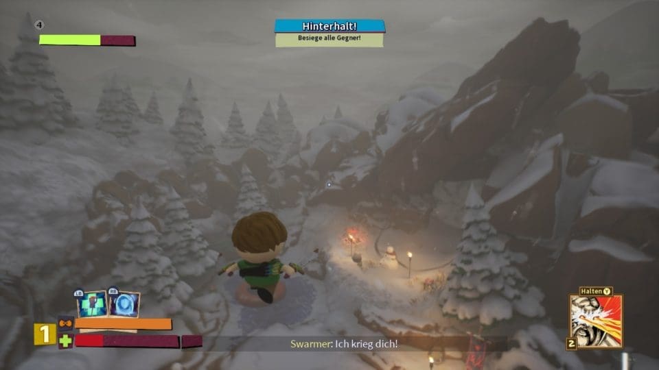 Zurück zum Spiel. Die Schule wird aufgrund des Schneechaos geschlossen, Cartman verlässt das Haus und nimmt uns zum Spielen mit. Zu Beginn wird uns erklärt, dass die Menschen die Todfeinde der Elfen sind, und das Krieg herrscht. Wir sind mit Schwert und Pfeil & Bogen bewaffnet, und bewegen uns mit drei Freunden (reale Menschen oder Bots) durch eine verschneite 3D-Welt, um Missionen zu erfüllen. Dabei erscheinen immer wieder Horden von Elfen, die wir mit unseren Waffen bekämpfen. Wir können mit dem Schwert zuschlagen, mit dem Bogen schießen, ausweichen, sprinten und springen. Durch Druck auf Y nutzen wir unsere Spezialfähigkeit, wie beispielsweise massiv zu furzen, um besonders hoch zu springen. Mit LT/RT könnt ihr Zaubersprüche wirken. Im Laufe des Spieles ist es möglich, unsere Ausrüstung zu verbessern oder auch zu ändern. Als Währung im Spiel dient… Klopapier. Das ist nämlich im Winterchaos überall ausverkauft und dementsprechend wertvoll. Wir erhalten auch spezielle Karten, die bestimmte Boni geben, wenn wir sie zu Beginn eines Kapitels auswählen, wobei wir während der Kapitel weitere Karten erhalten. Es gibt auch einen Skilltree, bei dem wir unsere Figur verbessern, wenn wir genug dunkle Materie haben. Den schalten wir bei Mr. Hankey frei, der auf einem WC wohnt… Insgesamt beinhaltet das Spiel 5 Kapitel, was nicht sonderlich umfangreich ist.