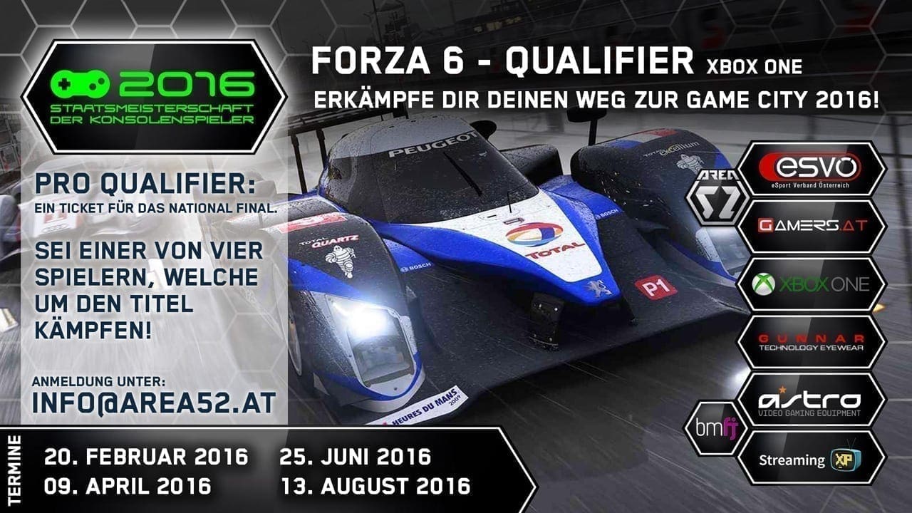 Diesen Samstag wird es wieder schnell in der Area! Die Qualifikation der Forza 6 Staatsmeisterschaft geht in die 2. Runde. Für Forza 6 Spieler stehen im 1on1 ereignisreiche Zeiten bevor. Ihr erhaltet, im Zuge der Konsolenstaatsmeisterschaft, mehrere Möglichkeiten euch für das Finale auf der Game City 2016 zu qualifizieren. Insgesamt gibt es 4 Tickets zu gewinnen, im Wiener Rathaus spielt ihr um den KSM-Titel sowie zahlreiche Preise.
