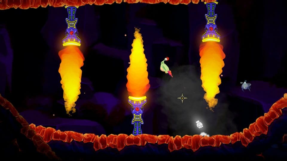 Der Spielablauf ist relativ einfach. Ihr könnt durch den Rückstoß eurer Pistole vom Boden abheben und euch in verschiedene Richtungen bewegen. Macht ihr nichts, sinkt ihr wieder langsam nach unten. Die Herausforderung liegt also darin, sich nur mit dem Rückstoß durch ein Höhlensystem voller tödlicher Gefahren (wie Dornen oder Flammen) zu bewegen. Das Spielprinzip mit dem dauernden Kampf gegen die Schwerkraft erinnert sehr an den Evergreen Thrust (Firebird, 1986) oder auch den Automaten Gravitar (Atari, 1982), ist aber bei weitem nicht so schwer (und frustrierend). Ihr könnt mit eurer Pistole auch schießen, um Schalter zu aktivieren oder Gegner zu bekämpfen. Die Pistole verfügt auch noch über einen besonders starken Energiestoß zur Anwendung in speziellen Fällen. Die Levels (es gibt in der Kampagne insgesamt fünf Welten mit jeweils 10 Level) sind relativ überschaubar und der Spielablauf ist immer sehr ähnlich – findet das Paket, weicht Gefahren und Gegnern aus, aktiviert und benutzt den Ausgang. Nachdem das Anfangs noch recht einfach ist, wird es im Laufe des Spieles deutlich anspruchsvoller und ihr benötigt einiges an Fingerspitzengefühl bei der Steuerung eurer Figur. Auch die Bosse am Ende der jeweiligen Welten erschweren euch das Vorankommen. Durch die Unterteilung in viele kleine Level eignet sich das Spiel hervorragend für ein kurzes Spiel zwischendurch, durch das Messen der Zeit ist es auch für Speedrunner interessant.