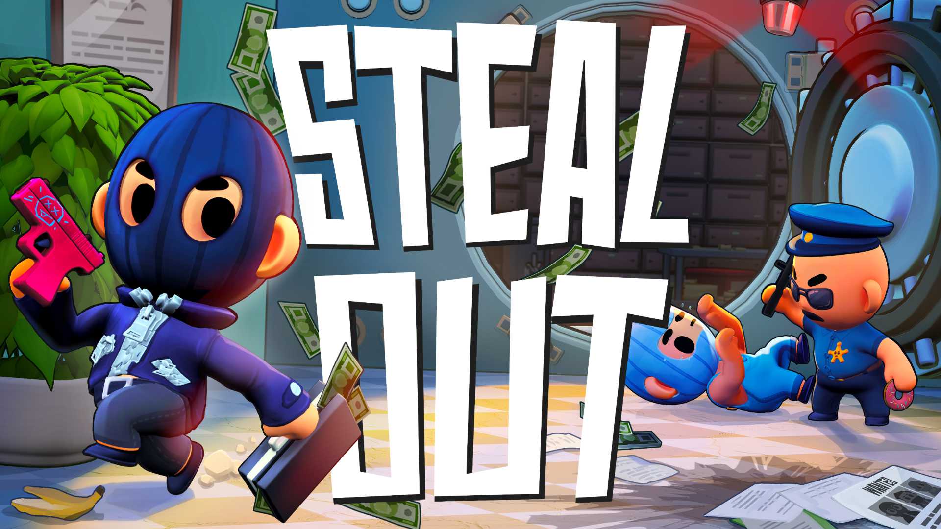 Steal Out besticht durch minimalistisches Design, kontrastreiche Schauplätze, einfache Steuerung sowie verschiedene Modi und Karten. Die Spieler:innen müssen Safes knacken, Beute schnappen und ihre Gegner:innen in einem chaotischen Multiplayer-Gefecht voller Lacher und Action überlisten.