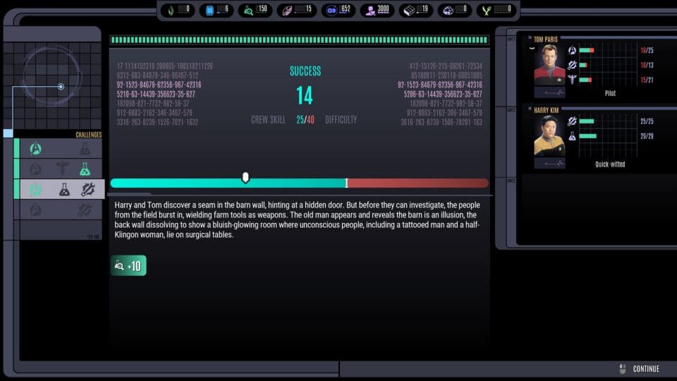 Bei den Missionen außerhalb der Voyager wählt ihr zuerst die (bis zu drei) Crewmitglieder, beamt sie zum Ziel und entscheidet dann aufgrund der Rückmeldungen eurer Crewmitglieder, wie sie vorgehen sollen. Dabei wird euch immer angezeigt, wie hoch das Risiko ist und danach wird das Ergebnis „ausgewürfelt“. Der Fortschritt wird mit Text und kleinen Bildern angezeigt. Nach mehreren Entscheidungen sind die meisten Missionen auch schon wieder vorbei und eure (überlebenden) Crewmitglieder wieder auf der Voyager.