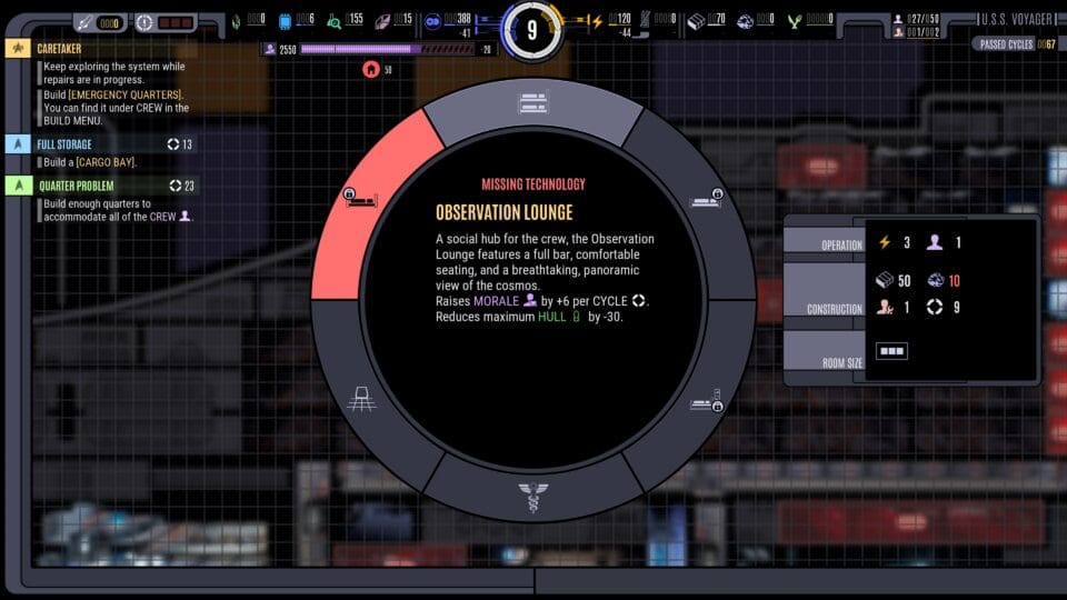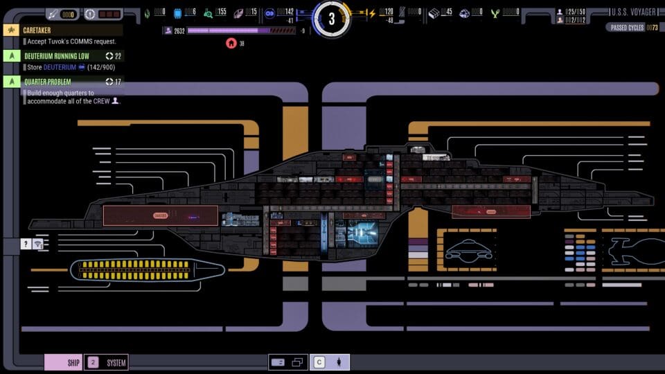Hier beginnt das Spiel – ihr scannt die umliegenden Planeten auf Ressourcen – Deuterium, Duranium, Tritanium für Treibstoff, Reparaturen und Neukonstruktionen, fliegt dort hin und wählt dann aus mehreren Optionen eure Aktion. Sicherer aber mit geringerem Ertrag, riskanter aber mit potentiell höherem Ertrag? Die Wahl liegt bei euch. Die Voyager besteht aus unzähligen Stationen, vom Warpkern-Antrieb über Mannschaftsquartiere, Biolabore, Frachträume, dem Transportraum zum Beamen, Engineering, Krankenstation, Brücke, Schildgenerator, Torpedoraum, Shuttle, Holodeck, Kantine und vieles mehr – ihr entscheidet, welche Räume instandgesetzt oder neu gebaut werden und wie in den einzelnen Stationen gearbeitet wird. Notfallrationen oder volle Mahlzeiten? Was soll erforscht werden? Wo werden eure Bautrupps eingesetzt?