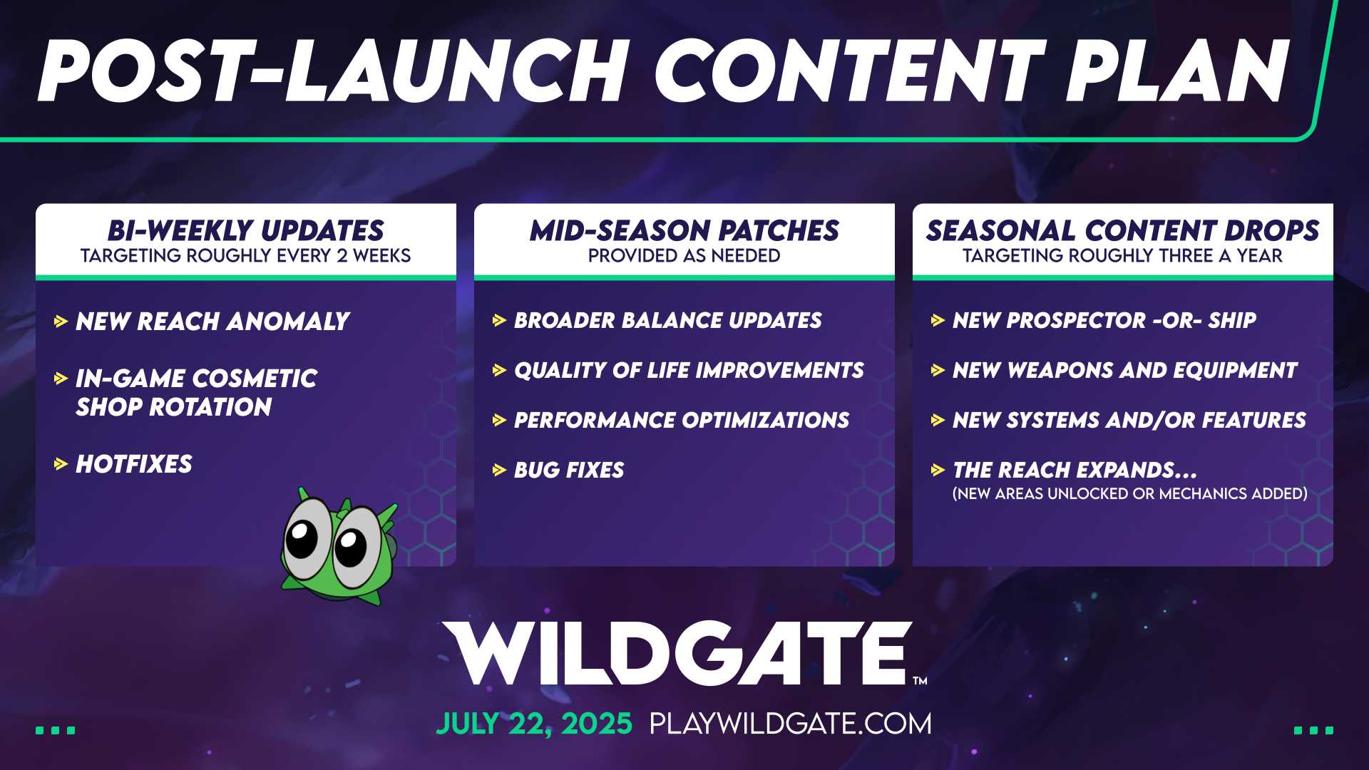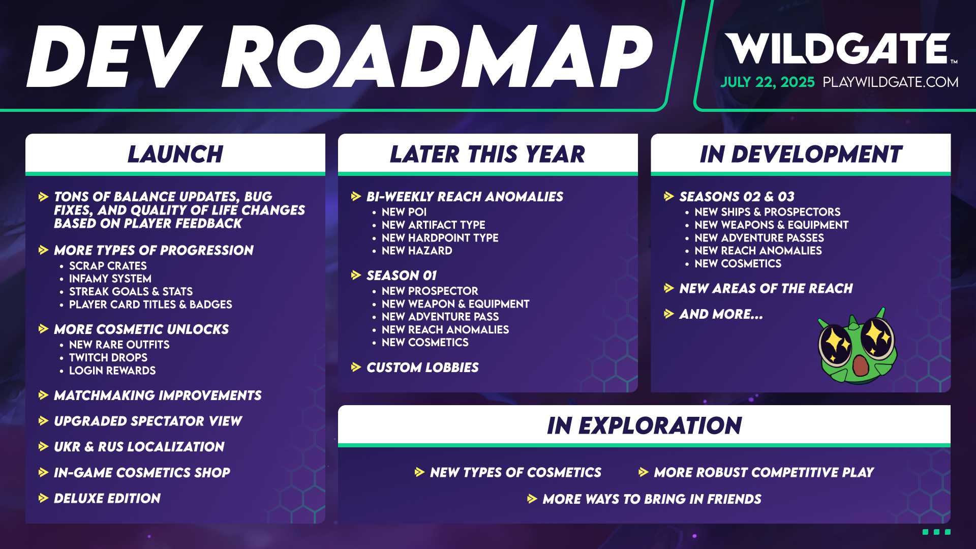 Die Roadmap gibt einen Überblick darüber, was Spielerinnen und Spieler zum Start und danach erwarten können, darunter die erste Saison des Spiels, Fortschrittsupdates, benutzerdefinierte Lobbys, eine Deluxe-Edition und vieles mehr. Auf Steam, PlayStation 5 und Xbox Series X|S.kann Wildgate schon jetzt auf die eigene Wunschliste gesetzt werden.