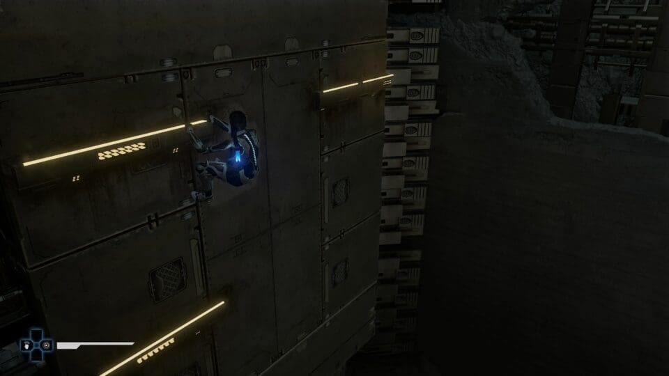 Nachdem wir dem ersten Angriff feindlichen Roboter entkommen sind, finden wir uns in einer großen Basis wieder. Roboter bewachen einzelne Bereiche, sie marschieren auf vorgegebenen Pfaden und greifen uns sofort an – wenn sie uns sehen. Die Kämpfe laufen auf Souls-Like übliche Weise ab – mit RS (Xbox Controller) könnt ihr einen Gegner fixieren, mit X bzw. Y schlagt ihr schnell oder besonders fest zu, mit B weicht ihr gegnerischen Schlägen aus oder rollt euch ab – ganz ähnlich wie schon in unzähligen Spielen zuvor. Noch besser ist es natürlich, wenn ihr euch an bestimmten Stellen (ähnlich wie im hohen Gras…) versteckt und Gegner lautlos von hinten eliminieren könnt. Ihr könnt auch ein Geräusch verursachen, damit Gegner in eure Richtung kommen, um euch zu suchen. Die Kletterpassagen laufen relativ einfach ab – Zoe kann besser springen als Enzio und stürzt nicht so leicht irgendwo ab. Vorsprünge, an denen ihr euch anhalten könnt, sind farblich gut markiert. Sie balanciert auch problemlos über dünne Metallträger in schwindelerregenden Höhen. Ihr müsst euch schon anstrengen, um beim Klettern in die Tiefe zu fallen. Das Spiel beinhaltet auch einige Parkour-Passagen. Hier müsst ihr natürlich schon aufpassen, nicht in einen unendlich tiefen Abgrund zu fallen und beispielsweise beim Rutschen in die richtige Richtung zu lenken und vor allem auch immer zum richtigen Zeitpunkt zu springen.