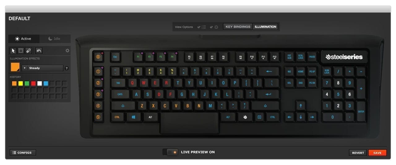 Die Apex M800 verfügt über ein ganzes Arsenal an konfigurierbaren Optionen inklusive einer unbegrenzten Profilanzahl, Makros und Beleuchtungseinstellungen, die alle von der SteelSeries Engine-Software gesteuert werden. Jede Taste kann einzeln auf eine der 16,8 Millionen Farben mit acht Helligkeitsstufen eingestellt werden. Zudem gibt es eine ganze Reihe von Beleuchtungsmodi wie Breathe, Wave, Trigger oder eigens kreierte Designs. Gamer können sich auch persönliche Cooldown-Timer für verschiedenen Spiele, In-Game-Ereignisse oder Aktionen erstellen. Kinderleicht lässt sich jede einzelne Taste mit einem Befehl, einer Mausfunktion, Medientaste, Anwendung oder einem Makro belegen. Zur Erleichterung der Makroprogrammierung ist diese auch on-the-fly in einem Spiel oder einer Anwendung durchführbar, damit Abfolge und Timing exakt zueinander passen.