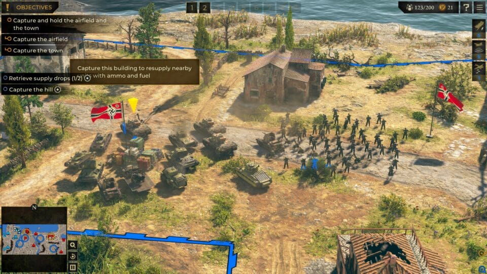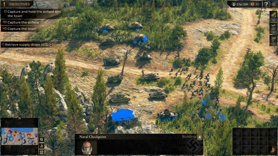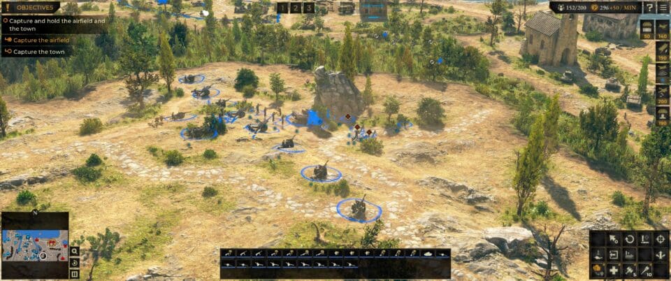 Alle vier Teile (und die Spin-Offs) haben keinen Basisbau (und mehr oder weniger keinen Nachschub) beinhaltet. Das hat sich nun auch bei Sudden Strike 5, entwickelt wieder von Kite Games, nicht geändert. Trotzdem spielt es sich mehr wie ein klassisches Echtzeit-Strategiespiel als wie ein Echtzeit-Taktikspiel. Ihr könnt nämlich Einheiten nachkaufen. Nicht unendlich viele, aber auch gar nicht so wenige. Basisbau gibt es auch weiterhin nicht, aber es gibt meist ein Gebäude, in dem ihr (zb durch die Erfüllung einer Aufgabe) verdiente Prestige-Punkte gegen neue Einheiten eintauschen könnt. Soldaten, Panzer, Kanonen… nicht unbedingt alle Modelle und in riesiger Menge, aber genug, um dringenden Bedarf abzudecken.