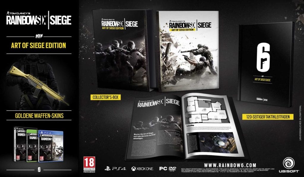 Sie beinhaltet das Spiel, eine Collector’s Box, ein Pack mit goldenen Waffenskins für alle Ingame-Waffen und einen exklusiven 120-seitigen Taktikleitfaden. Dieser hochwertige Leitfaden befasst sich mit allen Kernelementen des Spiels. Er enthält eine ausführliche Beschreibung jeder Antiterroreinheit, der Operators, der Waffen und Karten mit hochdetaillierten Übersichten und Statistiken. Alle diese Inhalte wurden gemeinsam mit dem Entwicklerteam unter Mithilfe von Hardcore-Gamern zusammengestellt, um Spieler bestmöglich auf ihre Matches vorzubereiten.