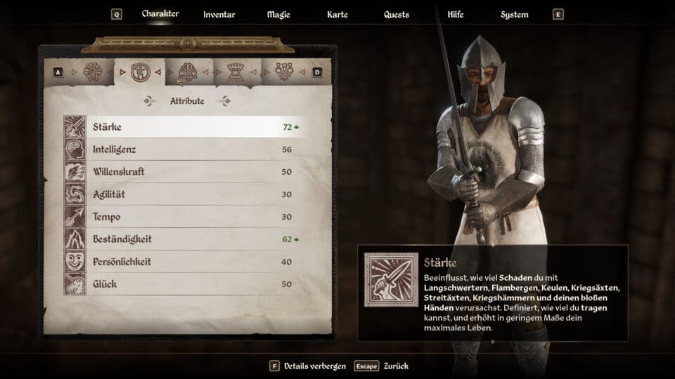 Das alte Levelsystem von Oblivion galt lange Zeit als einer der größten Kritikpunkte des Spiels – ein Punkt, den sich die Entwickler beim Remaster offensichtlich zu Herzen genommen haben. Für die Neuauflage wurde das System sinnvoll überarbeitet und an moderne Erwartungen angepasst. Zu Beginn – bei der Wahl der Klasse – erhält unser Charakter sieben Hauptfertigkeiten, in denen er besonders talentiert ist. Allgemein gilt: Fähigkeiten verbessern sich durch aktive Nutzung. Wer also wie ein Irrer durch Cyrodiil sprintet, steigert damit ganz automatisch seinen Athletik-Wert. Durch das Leveln der einzelnen Skills füllt sich unser Fortschrittsbalken zum nächsten Stufenaufstieg. Hauptfertigkeiten tragen dabei deutlich mehr zur Erfahrung bei als die übrigen, was die Bedeutung der Klassenwahl unterstreicht. Sobald ein Stufenaufstieg erreicht ist, müssen wir lediglich ein Bett aufsuchen und ein kurzes Nickerchen halten – schon dürfen wir 12 Attributspunkte verteilen. Mehr Ausdauer? Dann investieren wir in Willenskraft. Mehr Magicka? Dann ist Intelligenz gefragt. Im Original war die Anzahl der verfügbaren Punkte stark davon abhängig, welche Fähigkeiten man zuvor verbessert hatte – und nicht selten kam man mit deutlich weniger als 12 Punkten aus dem Level-Up heraus. Auf Dauer konnte das frustrierend sein. Zum Glück gehört dieses eher unschöne System jetzt aber endlich der Vergangenheit an. Übrigens: Wenn bestimmte Fähigkeiten ein höheres Level erreichen, schalten wir passive Boni frei, die unseren Charakter noch mächtiger machen – ein weiterer Anreiz, gezielt an bestimmten Spielstilen zu feilen.