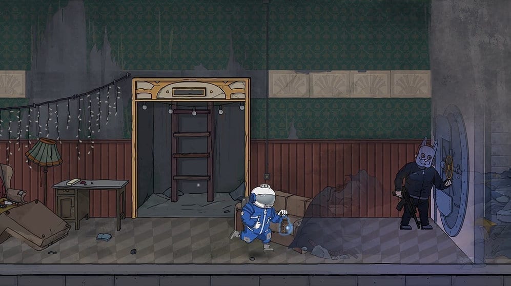 Das Geschehen zwischen den Zeitsträngen spielt nach den Regeln des klassischen Side-Scrollers. Mit unserem Helden ist es möglich, sich nach links und rechts durch die Spielwelt zu bewegen. Springen kann er ebenfalls und, wie mir scheint, hat sich nicht nur die Erdoberfläche, sondern auch die Erdanziehung während seiner 100 Jahre Kryo-Schlaf geändert – natürlich fühlt sich der Sprung des Astronauten nämlich nicht an. Ebenso gibt es keinen genauen Indikator dafür, wie lange es dauert in eine andere Zeit zu reisen. In manchen Situation wäre mir ein visuelles Feedback lieber gewesen als das Geräusch einer Laterne. Auch die Gestaltung der Gegner ist eher mangelhaft. Dabei spreche ich nicht von der visuellen Gestaltung, sondern dem Gameplay. Zwar ergeben sich kombiniert mit dem Zeitreisen Möglichkeiten, Gegner zu umgehen, aber heruntergebrochen läuft es immer auf ein nerviges Wartespiel hinaus. Außerdem: Wird man erwischt, heißt es zurück zum letzten Checkpoint und das Ganze beginnt von Neuem. Besonders mit einer Zeitreise-Mechanik hätte man hier weit mehr herausholen können.
