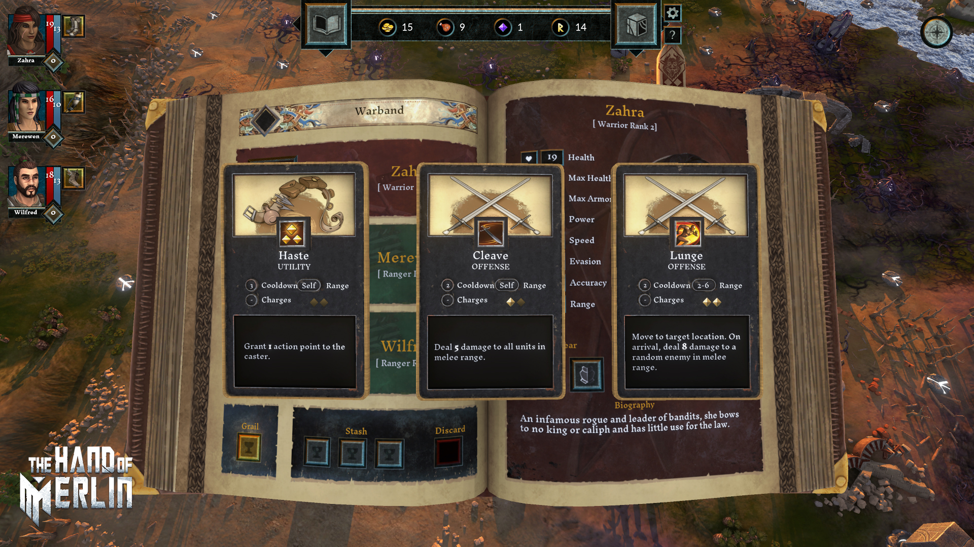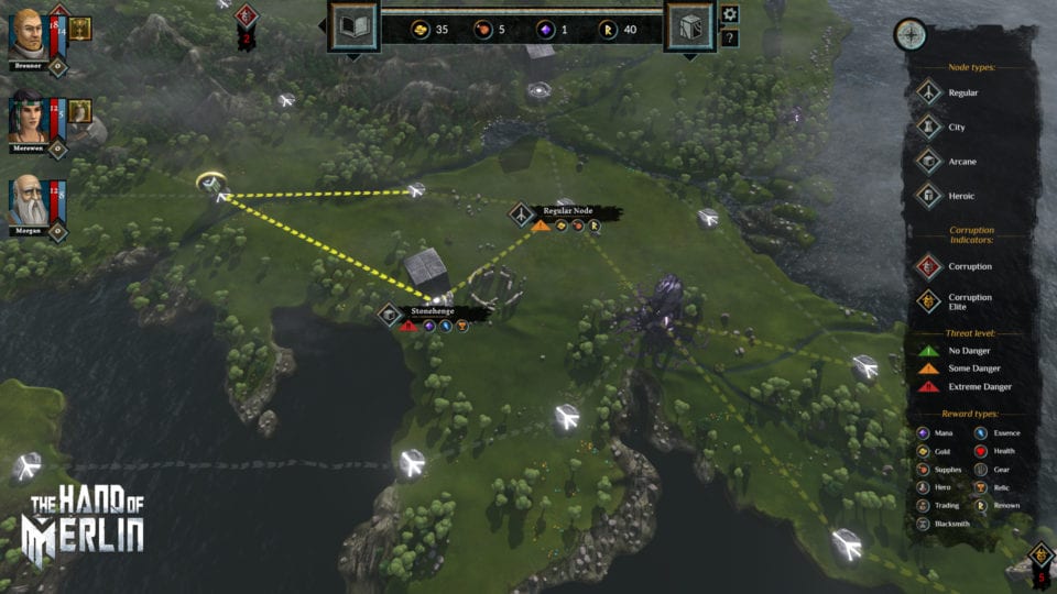 Zu Beginn wählen wir uns drei Helden für unsere Gruppe aus. Die Wahl fällt uns leicht, weil anfangs ohnehin nur drei Helden zur Auswahl stehen. Weitere sechs können im Lauf des Spieles freigeschalten werden und in zukünftigen Runs verwendet werden. Wir wählen also die drei Helden, einen melancholischen Krieger, einen depressiven Heiler (der allerdings verdammt gut kämpfen kann) und eine Fährtensucherin mit ihrem Bogen. Die Einflüsterungen von Merlin leiten uns zum Sitz des Königs, dem Schloss Camelot. Dort sollen wir den Heiligen Gral an uns nehmen und danach über Albion, Marca Hispania, al-Andalus und schließlich über das Meer nach Jerusalem reisen. Merlin meint damit, dass wir zuerst unsere Heimat Albion (wo sich auch das Schloss Camelot befindet) durchqueren müssen, dann nach Frankreich übersetzen sollen, die Pyrenäen überqueren, durch das von den Mauren besetzte Spanien zu einem Hafen ziehen und dann mit einem Schiff nach Jerusalem segeln sollen.
