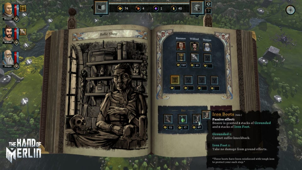 Wenn ihr auf Gegner aus der anderen Dimension trefft werden Informationen über diese automatisch in eurer Reisejournal eingetragen und können von euch jederzeit nachgelesen werden. Ganz praktisch. Allerdings ist das Buch bei jedem neuen Run wieder leer – finde ich dämlich. Naja, nachdem es nur sieben verschiedene Gegner aus der Paralellwelt gibt, wäre der Monsterteil im Buch sonst auch ziemlich schnell vollständig. Mit den manchmal erhaltenen Essenzen (Splitter von Merlins Macht) könnt ihr bis zu vier relativ mächtige Zaubersprüche im Beschützerwürfel freischalten – permanent, daher auch für weitere Läufe. In den Städten können wir mit unserem Gold die Dienste eines Heilers in Anspruch nehmen, was auch meistens dringend notwendig ist. Für das restliche Gold können wir unsere Ausrüstung beim Schmied verbessern, Nahrungsmittel oder Reliquien kaufen. Ihr könnt auch Nahrungsmittel oder Reliquien verkaufen, wobei ich es nicht empfehlen würde, den Heiligen Gral zu Gold zu machen. Glaubt mir, ich hab’s versucht und mich nicht lange an dem vielen Gold erfreut. Vom bescheidenen Glücksbringer eines Bauern bis hin zu Arthurs legendären Schwert Excalibur sind Gegenstände mit magischen Kräften in der Welt verstreut. Einige davon können wir bei Händlern erwerben, andere müssen wir uns durch heldenhafte Taten – oder kluges und listiges Vorgehen – verdienen.