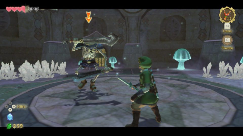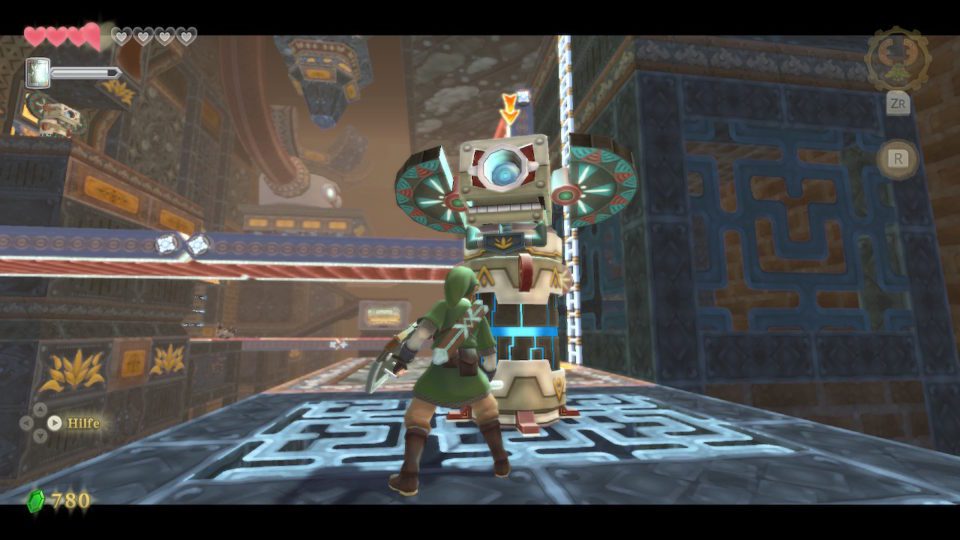 Diese Problematik zu entschärfen war auch bei der Entwicklung des Remasters ein entsprechend großes Thema. Die Switch verfügt zwar über etwas bessere Bewegungssteuerungs-Möglichkeiten als die Wii, aber auch diese sind alles andere als perfekt. Zudem gibt es einfach (zu) viele Spieler*innen, die dem Herumfuchteln mit Controllern ganz prinzipiell wenig abgewinnen können. Darum bietet Nintendo diesmal eine Alternative: Auf Wunsch kann man die Schwertsteuerung auch auf den rechten Stick legen. Mit ein wenig Training funktioniert das ganz gut, auch wenn man den Stick nicht zu zaghaft in die entsprechende Richtung bewegen darf. Das einzige Manko: die traditionell ebenfalls am rechten Stick angesiedelte Kamerasteuerung fällt damit natürlich flach. Man kann die Kamera nur bewegen, wenn man gleichzeitig die linke Schultertaste gedrückt hält – sehr gewöhnungsbedürftig.