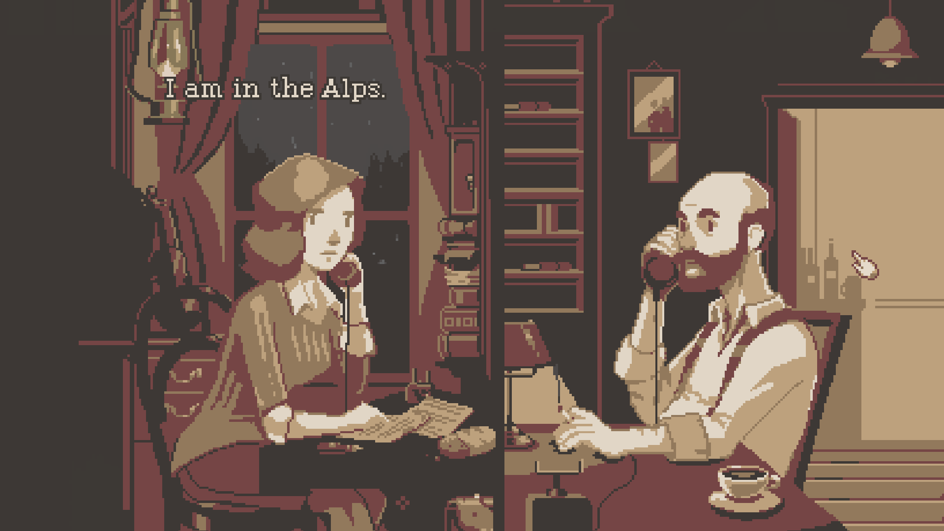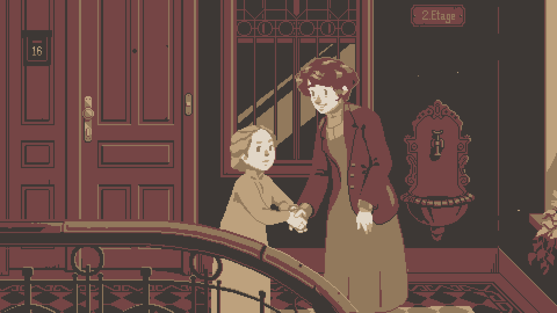 Bei der Optik bleibt man ebenfalls dem 20. Jahrhundert treu. In braunen Sepia-Farben gehalten, präsentiert sich The Lion’s Song in waschechtem Pixel-Look. Hintergründe und Figuren sind zwar liebevoll und den Möglichkeiten entsprechend detailliert gezeichnet, aber nur minimal animiert. Überhaupt erinnert das Spiel stark an die ersten Zwischensequenzen der NES-Ära.