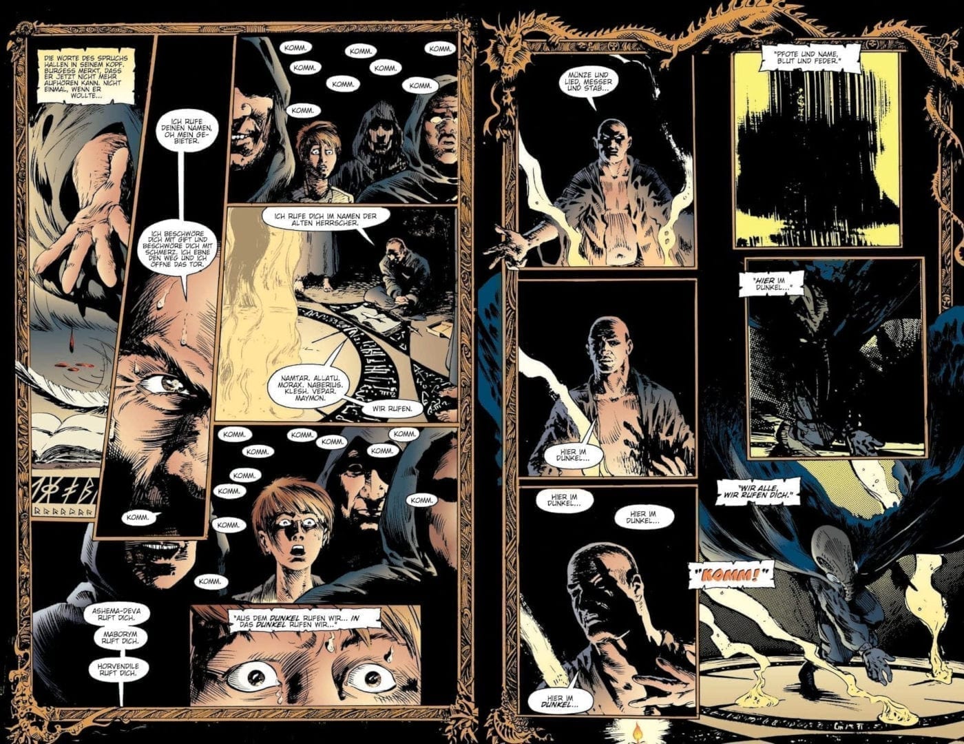 In den ersten Geschichten von The Sandman hat man das Gefühl, dass Neil Gaiman noch nicht wusste wie er den Sandman einordnen sollte, denn er existiert in einer Welt mit Batman und der Justice League, die einen nicht unerheblichen Teil der Story einnimmt. Diese Elemente fühlen sich für mich, so sehr ich sie in ihren eigenen Storys liebe, wie Fremdkörper an, die mich aus dieser kreativen und philosophischen Welt reißen. Zum Glück lässt Gaiman diese Figuren fallen und widmet sich passenderen Charakteren. Wie den Brüdern Kain und Abel, den Hauptdarstellern der ersten Geschichte die von Menschen erzählt wurde. Sie sind Diener Dreams und gefangen in einer Abwärtsspirale aus Mord und Auferstehung. Oder der Korinther, ein von Dream erschaffener Alptraum, der in seinen Augenhöhlen Zähne statt Augen verbirgt und auf einem Jahrestreffen für Serienmörder sein Unwesen treibt. Wem das noch nicht genug ist, der bekommt auch noch den Fürst der Hölle selbst geboten.