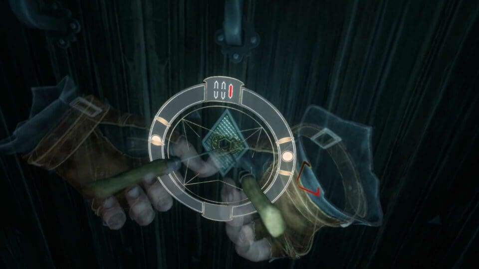 Stealth bedeutet aber auch, möglichst unerkannt durch die Gassen zu schleichen und auf Türme zu klettern und in offene Fenster einzusteigen. Selbst durch die Kanalisation können wir uns in geduckter Haltung bewegen um an den Wachen vorbei zu schleichen. Ein Kristall auf unserer rechten Hand zeigt uns den Grad, wie sehr uns die Dunkelheit beschützt, oder wir von den Feinden gesehen werden können. Zusätzlich erlaubt uns eine Art Röntgenblich, die „Glyph Vision“ versteckte, aber wichtige Elemente im Spiel zu erkennen wie Leitungen oder nützliche Gegenstände.