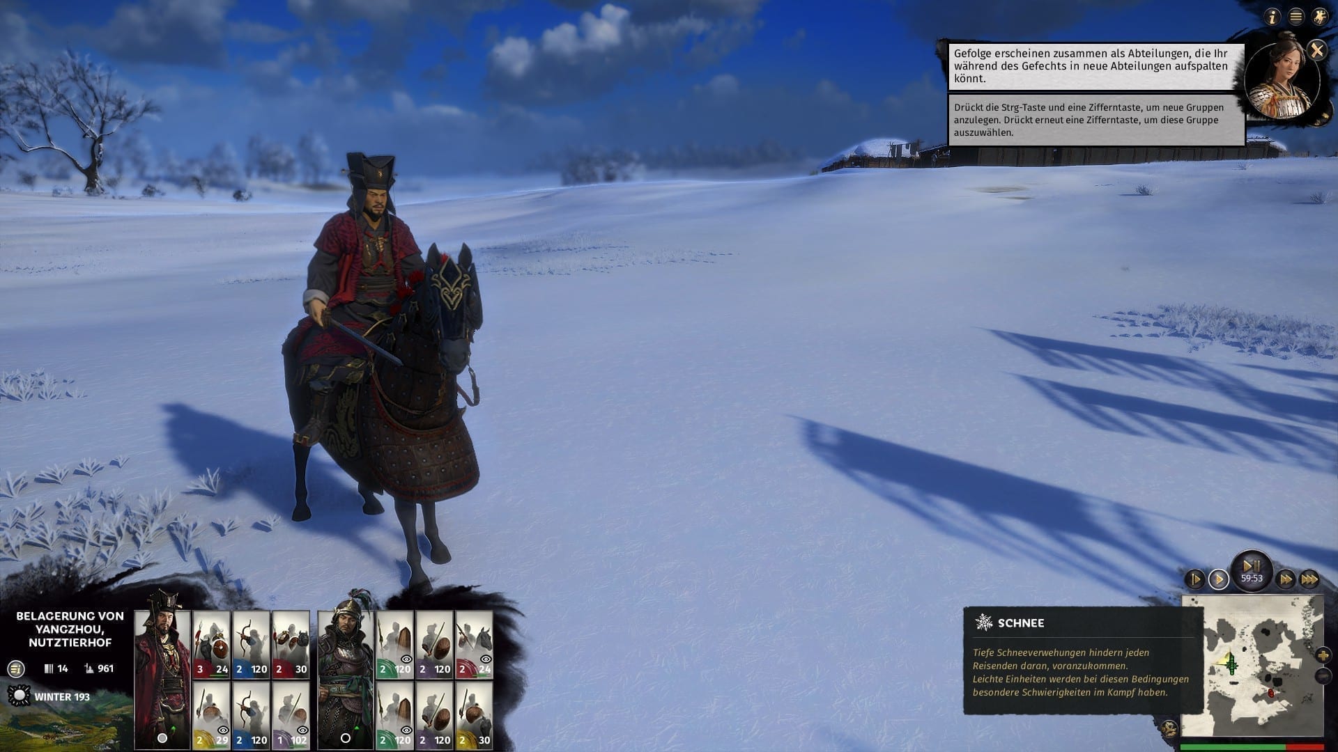 Jede Streitmacht kann bis zu drei Helden fassen. Wir wählen dabei aus insgesamt fünf Klassen aus. Jetzt konfrontiert uns Total War: Three Kingdoms mit einem interessanten Kniff: Jeder General ist auf gewisse Einheiten spezialisiert und kann nur diese unter seinem Kommando haben. Diese taktische Komponente zwingt uns zur Planung und macht die Schlachten wieder interessant. Zwar lässt sich mit gewissen Reformen diese Einschränkung etwas umgehen und es lassen sich auch andere Einheiten zuweisen, aber um ein Optimum aus unseren Leuten heraus zu holen, sollte man immer auf die optimale Zusammensetzungen achten.