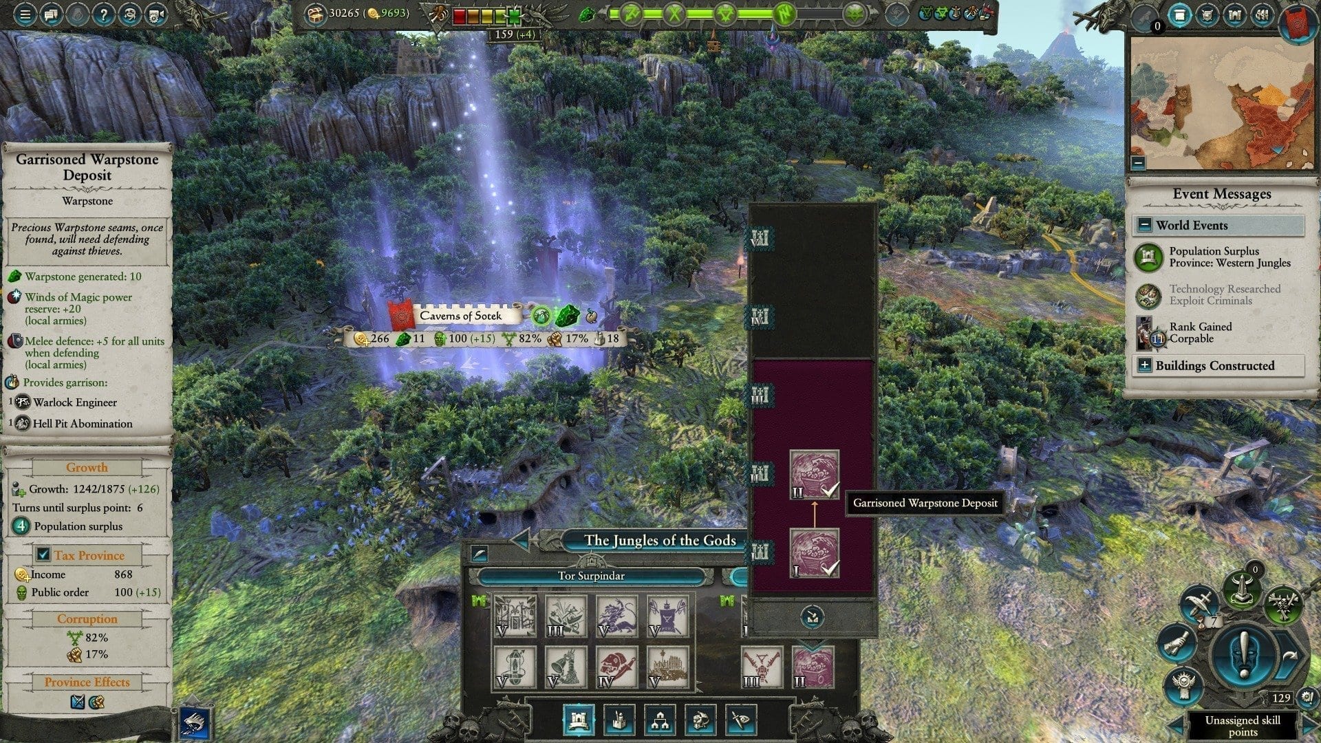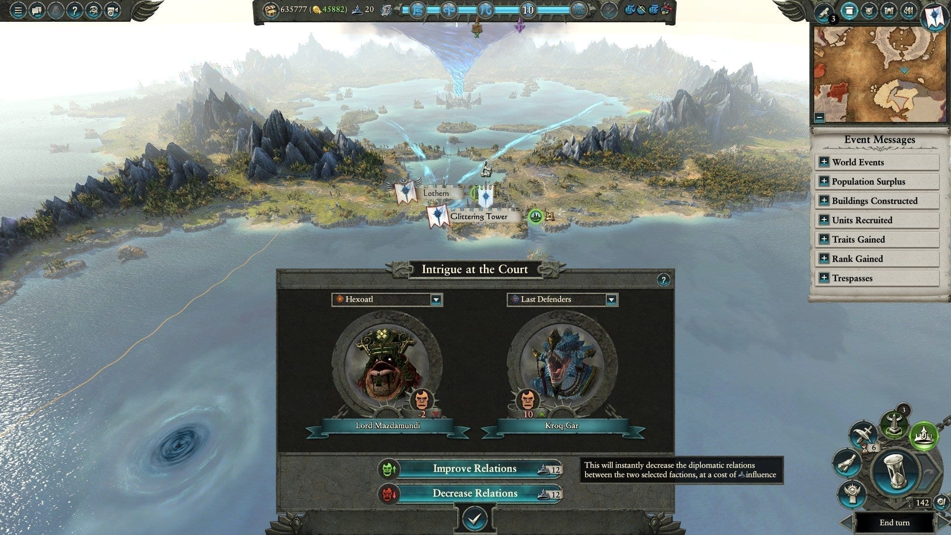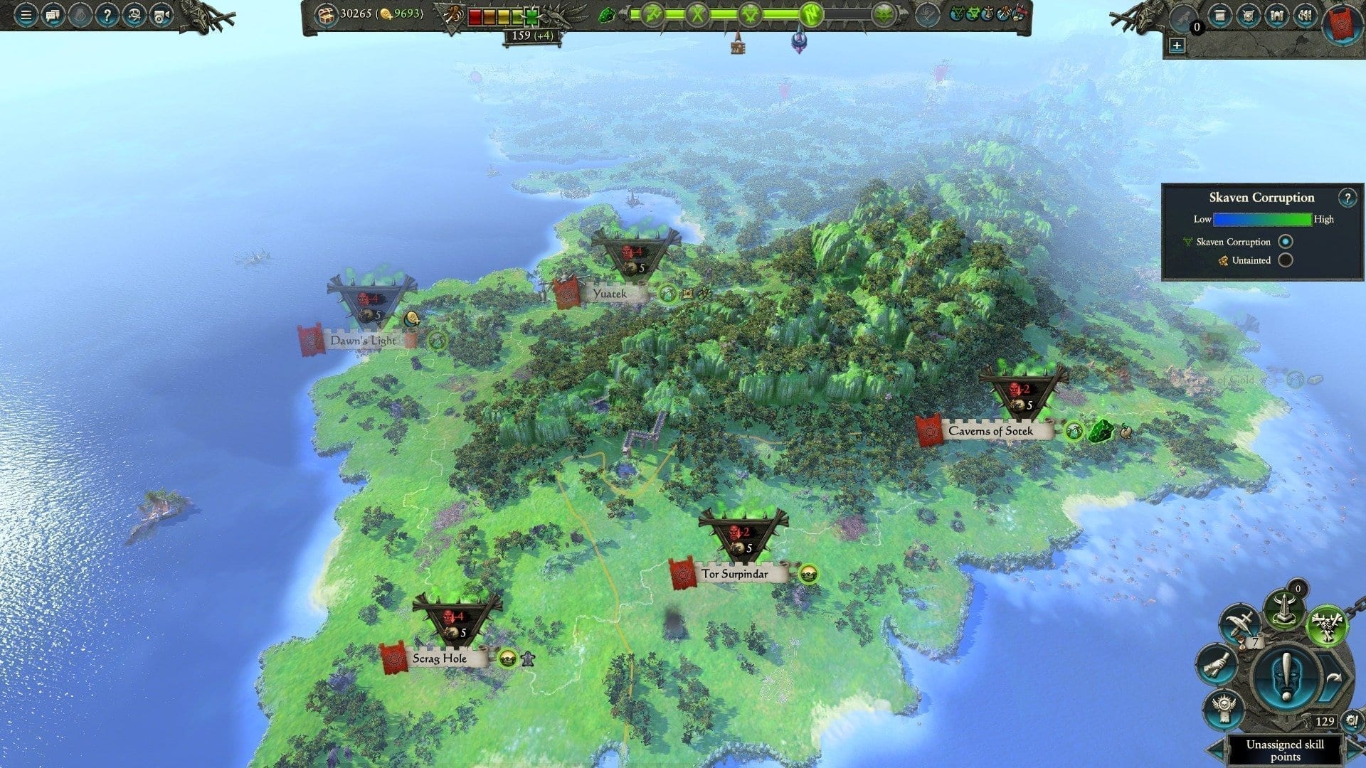 Der Mahlstrom ist aber auch Ausgangspunkt der Einzelspieler-Kampange von Total War: Warhammer II, die damit eine zusammenhängende Geschichte erzählt- zumindest ansatzweise. In dieser folgt jede Rasse ihrer eigenen Motivation, welche Ihr im Laufe der Story mittels kurzen Zwischensequenzen näher erläutert wird. Hochelfen und Echsenmenschen versuchen etwa den Mahlstrom zu stärken, um der drohenden Gefahr Einhalt zu gebieten, während andere Völker den Strudel zerstören wollen, damit sich das Chaos auf der Welt ausbreiten kann. Mit dieser ungewöhnlichen Ausgangssituation ergibt sich auch eine neue Sieg-Bedingung: Jede Rasse muss fünf Rituale durchführen, um dem Mahlstrom zu stärken oder zu schwächen, und danach siegreich aus dem finalen, kataklytischen Kampf hervortreten. Um so ein Event durchzuführen , benötigt man Ritualwährung. Diese bekommt man im Kampf, bei Eroberung sowie Aufgabenschlachten und wird auch in wichtigen Siedlungen generiert. Hat man genug dieser Ressource gesammelt, darf mein ein Ritual starten. Das dauert dann zwischen 10 und 20 Runden, währenddessen man drei zufällig ausgewählte Städte und Siedlungen im eigenen Reich vor Angriffen beschützen muss. Schafft man das nicht, beginnt man wieder von vorne.