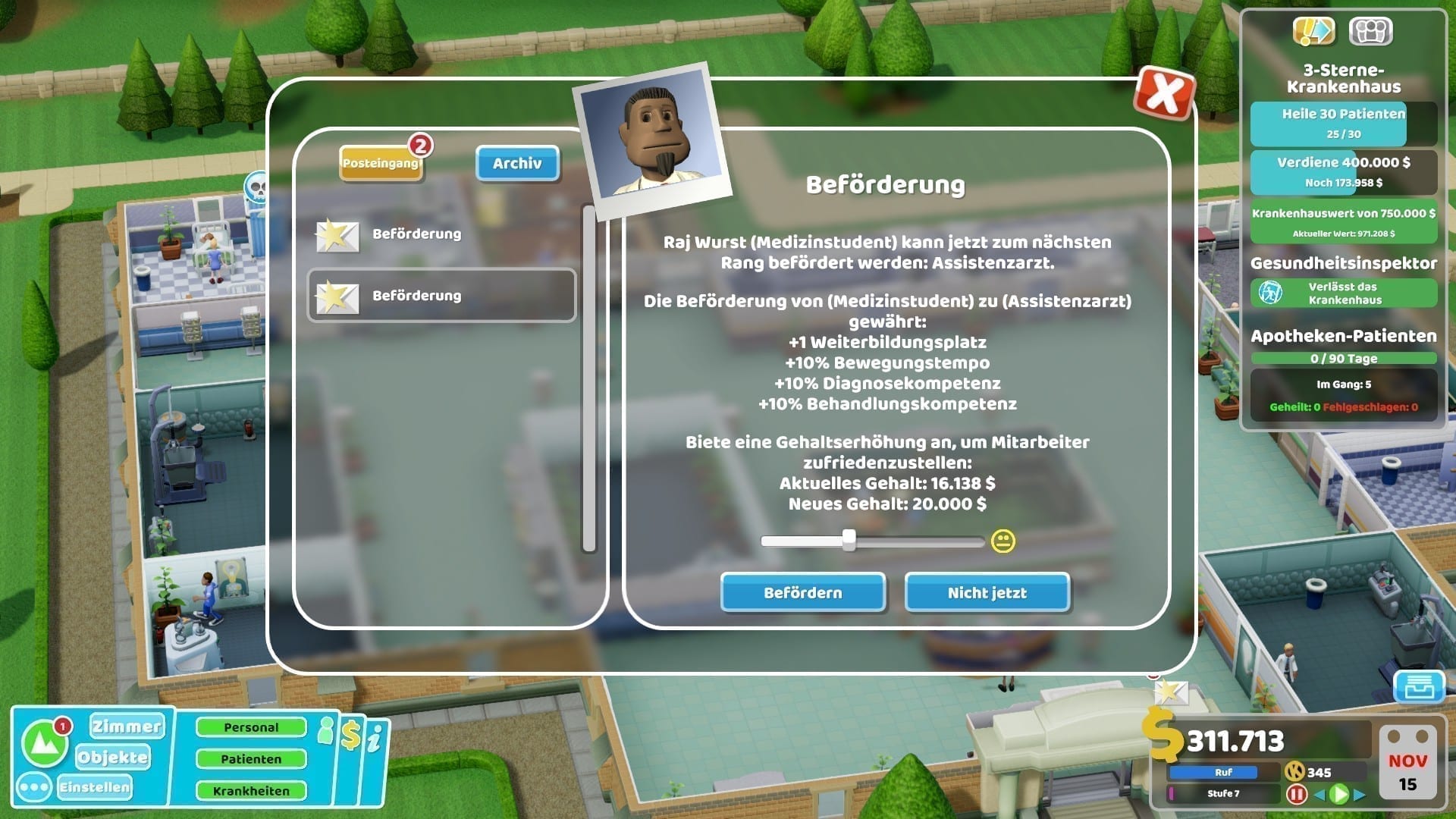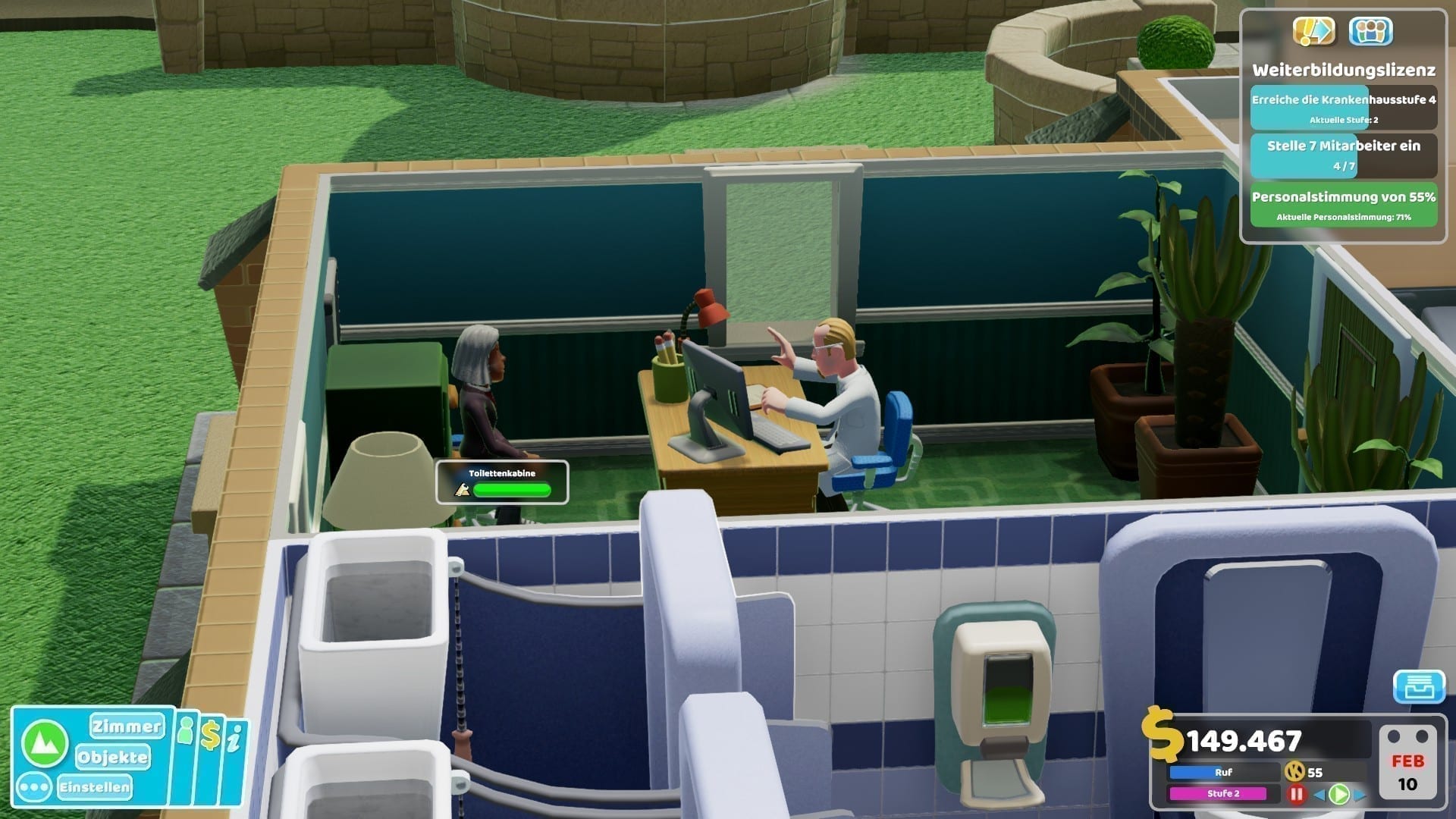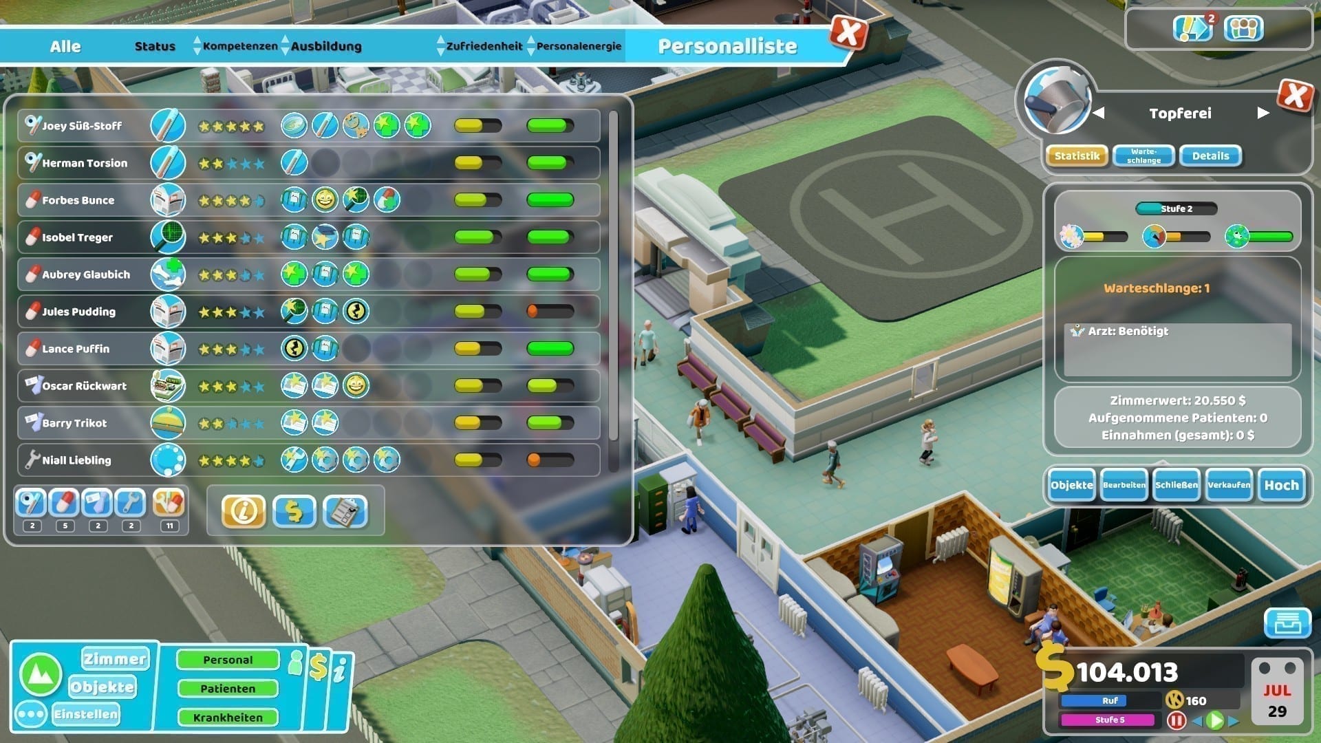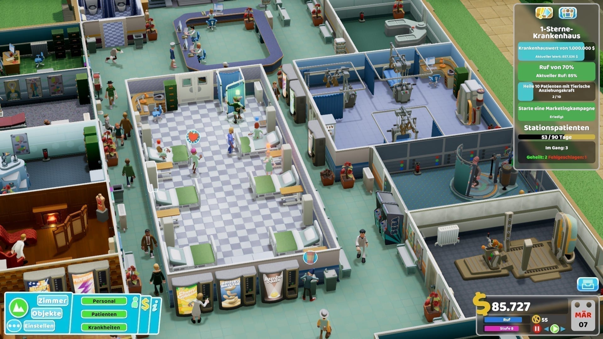 Haben wir es endlich geschafft, eine Rezeption samt Assistenten zu platzieren, kommen auch schon die ersten Patienten. Diese werden dann für eine Erstdiagnose in einen Untersuchungsraum verwiesen. Sobald wir dann den ersten Arzt eingestellt haben, wird uns eines recht schnell klar: Jetzt geht der Wahnsinn richtig los!