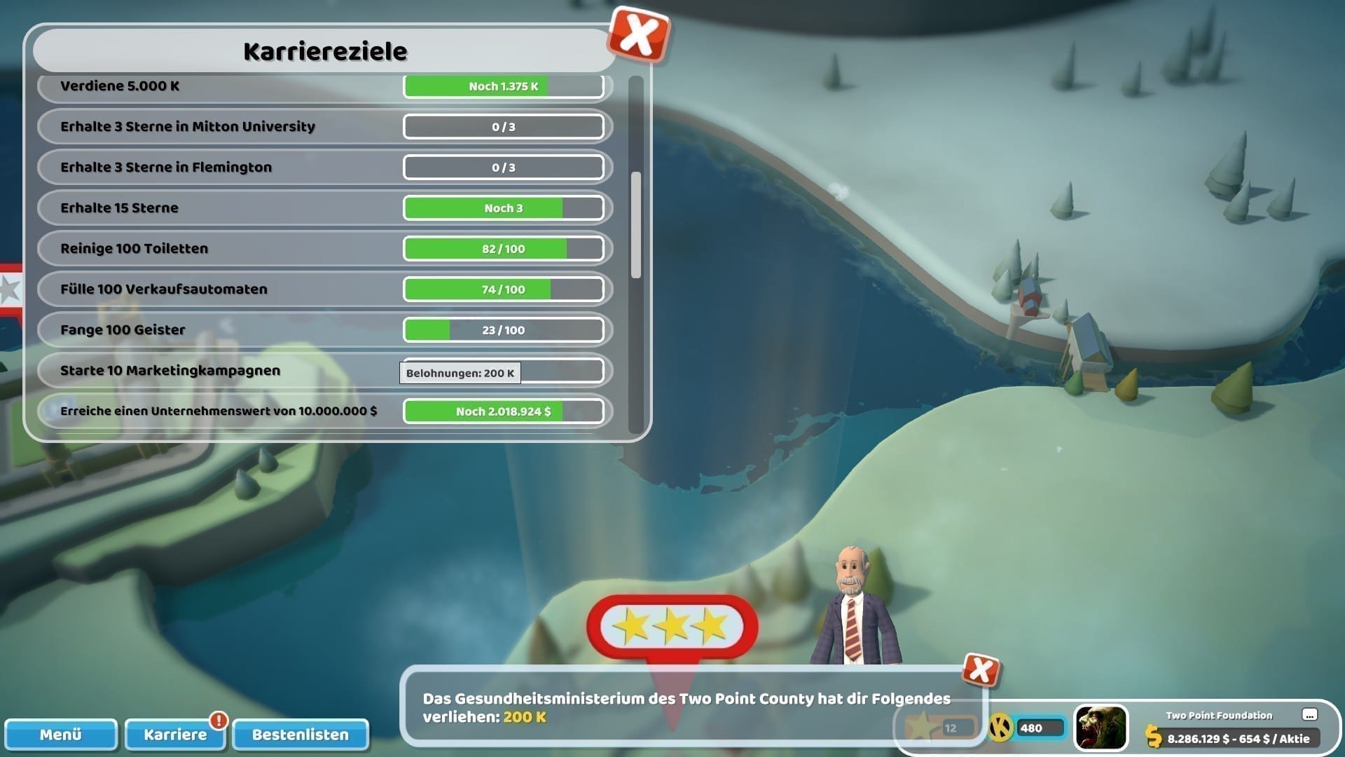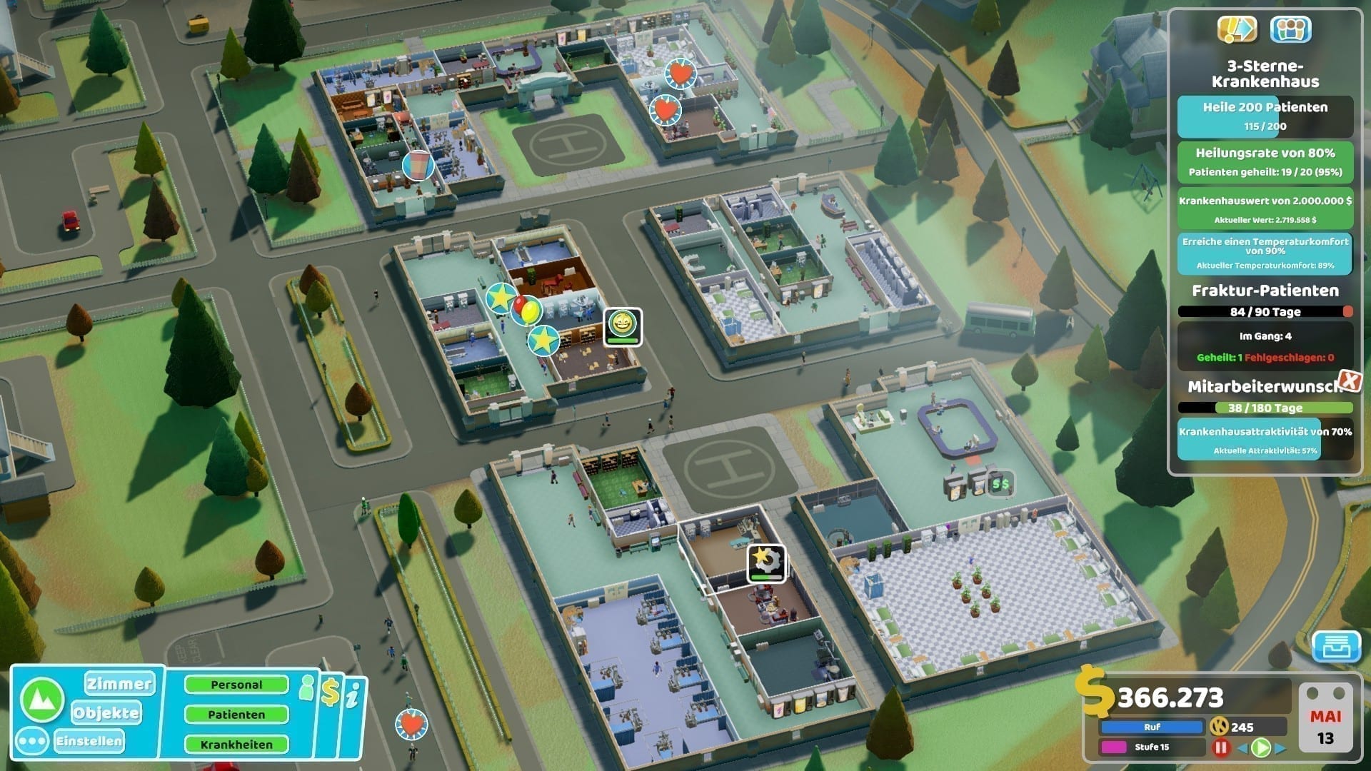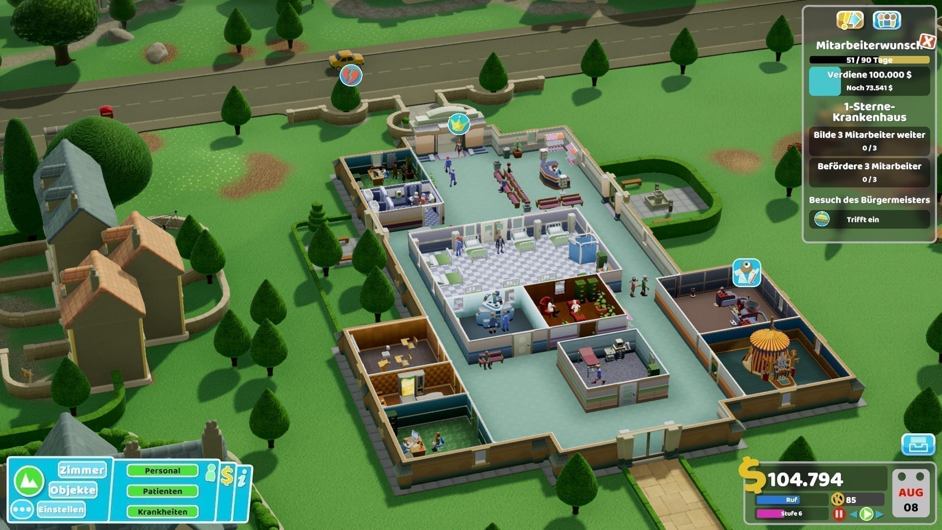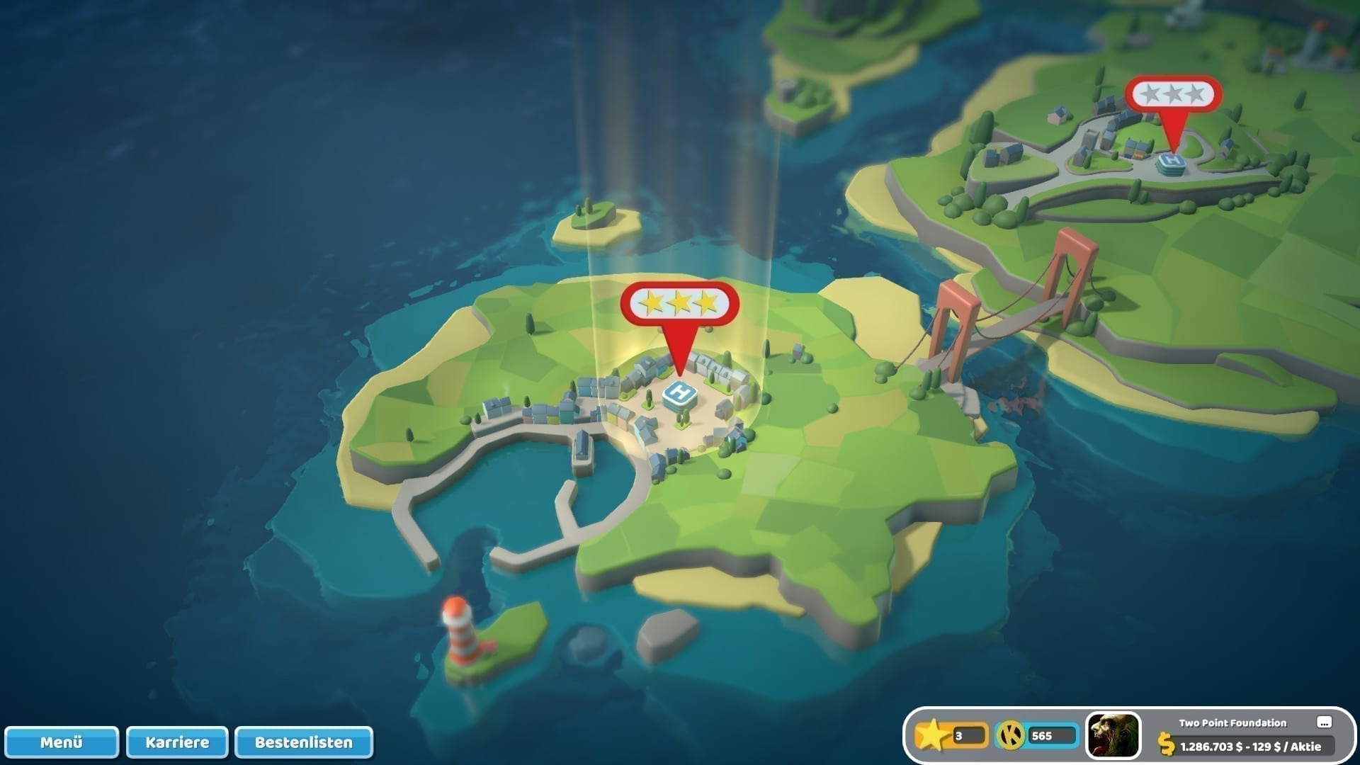 Wir starten unsere Karriere als Hospitalsunternehmer im kleinen Hogsport-Krankenhaus. Two Point Hospital bietet eine Vielzahl an Levels mit eigenen Herausforderungen und Gegebenheiten. Ziel ist es, in jeder Klinik eine Drei-Sterne-Wertung zu erhalten. Je höher die Durchschnittswertung unserer Hospitäler ist, desto mehr Marktwert hat auch unser Unternehmen. Aber das ist schon sehr weit vorgegriffen. Lasst uns daher wieder zu unseren ersten kleinen Schritten als angehender Spitalskonzern im Hogsport-Krankenhaus zurückkehren.