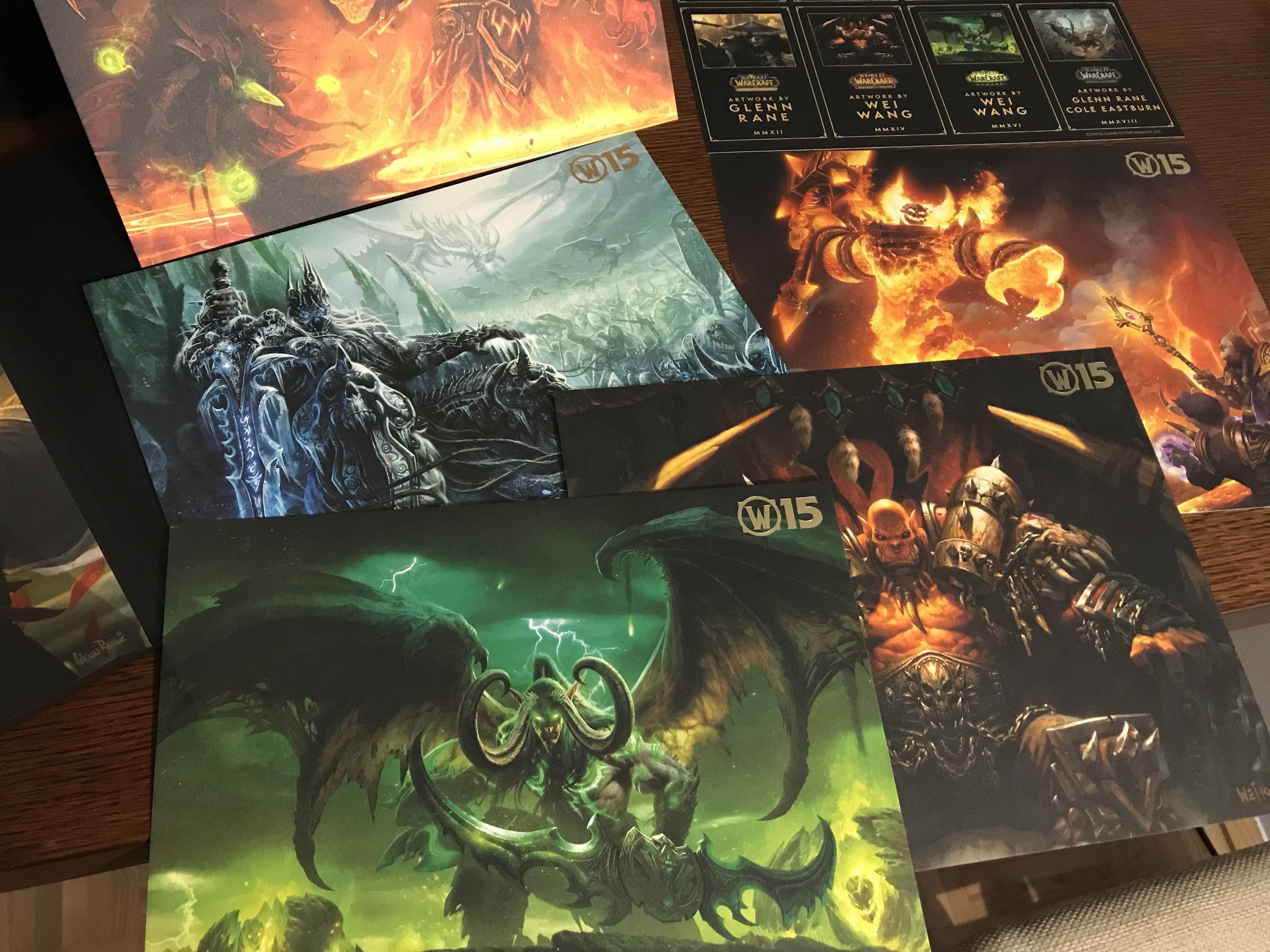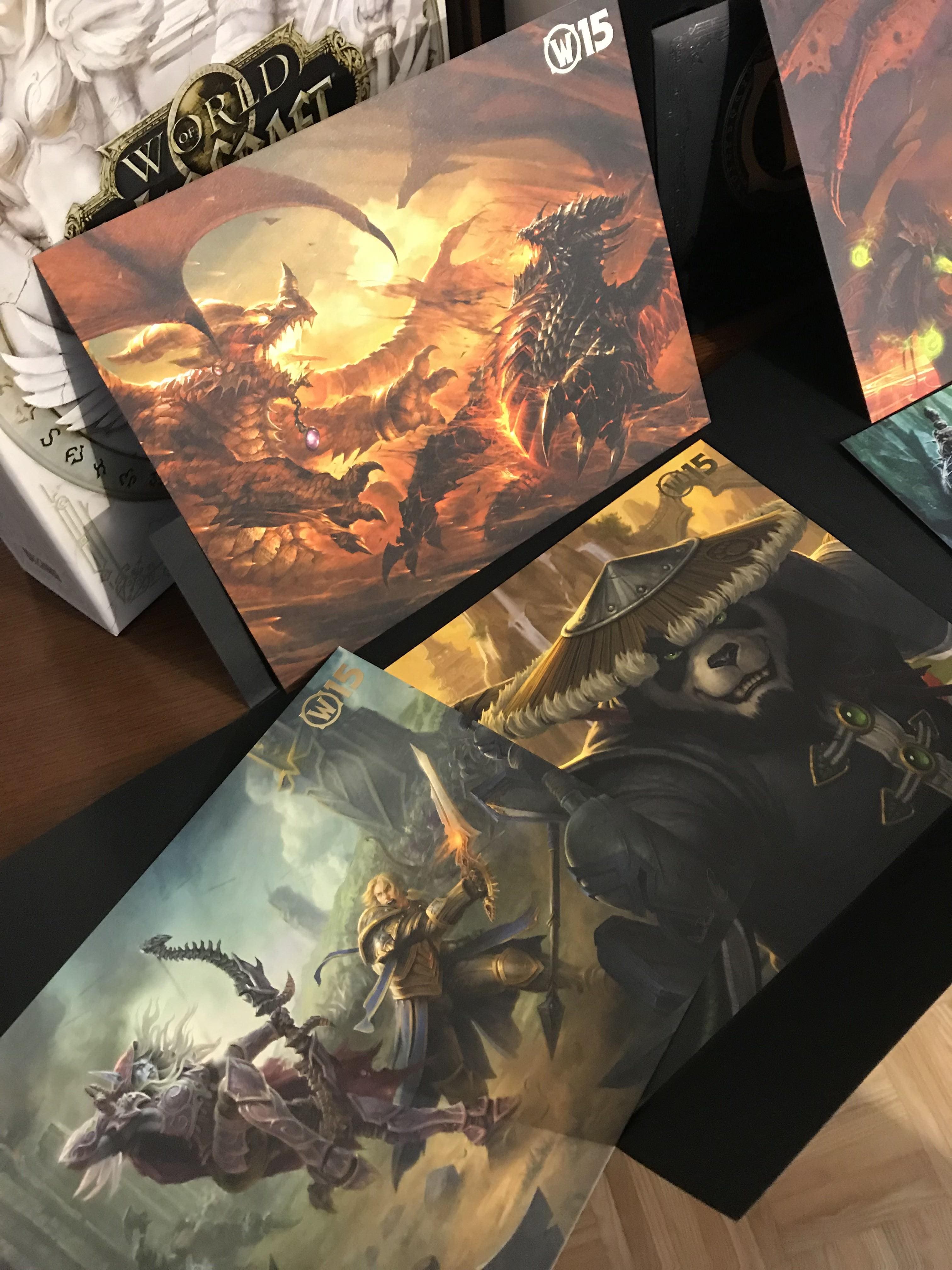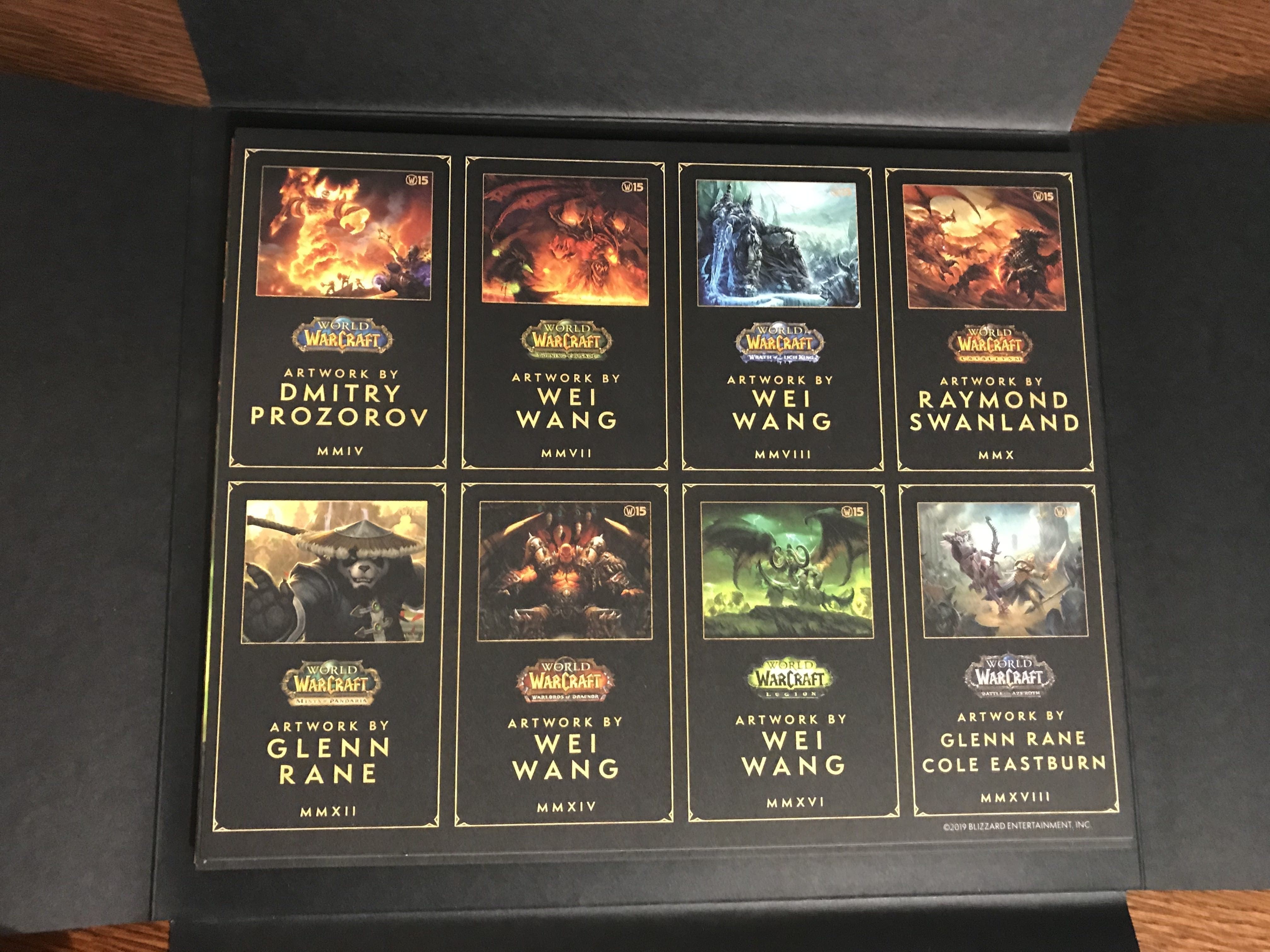 Nach Öffnen der Collectors Edition erblickt man sofort die ersten Inhalte. Verpackt in einen edlen schwarzen Umschlag, verziert mit goldenen Ornamenten, finden sich Grafiken, welche jeweils eine Erweiterung in der Geschichte von World of Warcraft symbolisieren. Diese wurden teils vom offiziellen Cover des jeweiligen Addons inspiriert oder direkt übernommen, teils zeigen sie aber auch ganz neue Ausschnitte des jeweiligen Inhaltes.