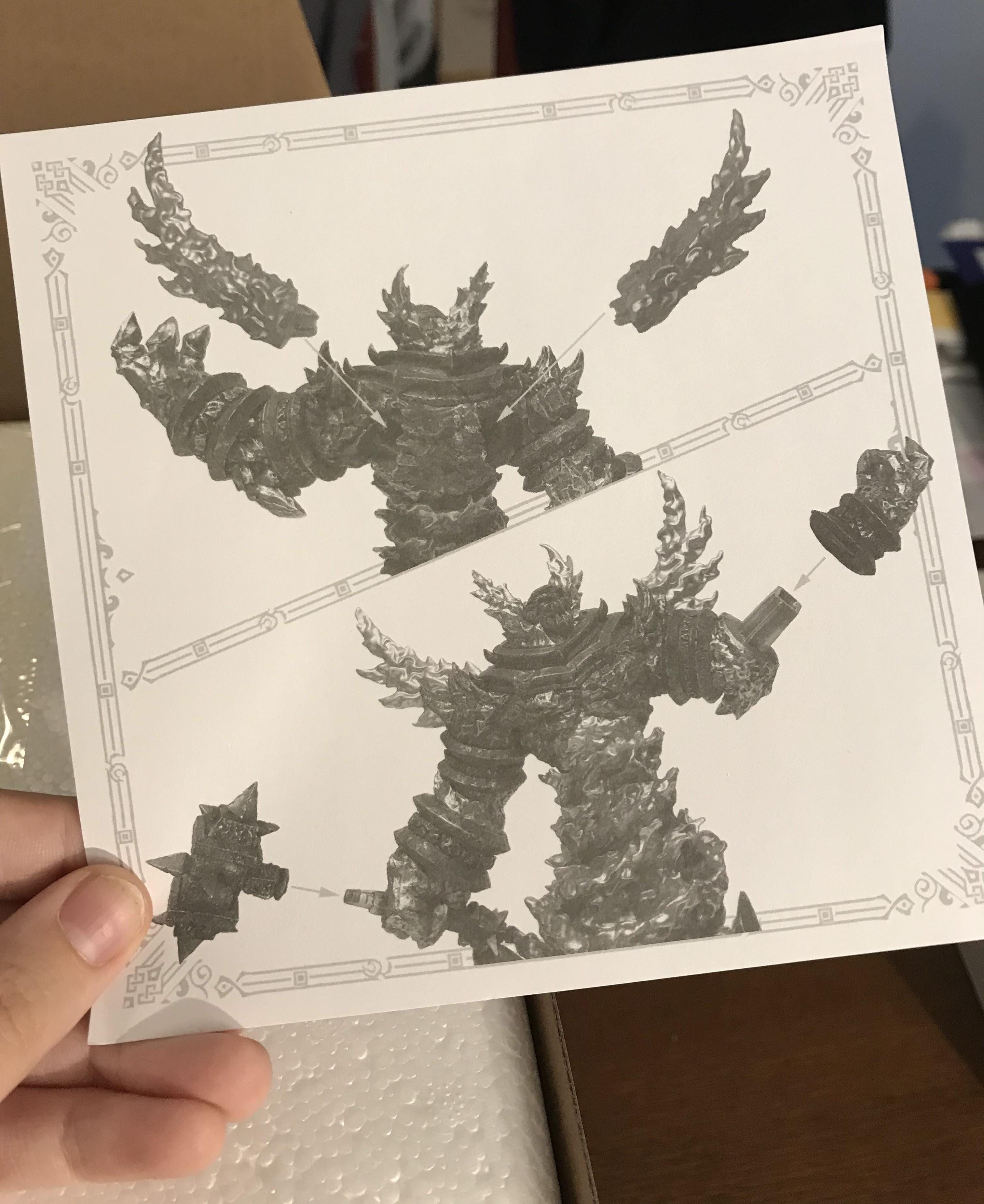 Das Highlight der Edition kam natürlich zuletzt: die Statue des Feuerlords Ragnaros. Ragnaros stellte im ursprünglichen World of Warcraft den allerersten Raidboss dar, und ist deswegen ein großes, nostalgisches Highlight für die Fanbase. Als ich die Statue zum ersten Mal aus der Verpackung nahm, war ich kurzzeitig sehr irritiert. Diese kommt nämlich nicht fertig aufgebaut, sondern will noch zusammengesetzt werden. Die Feuerflügel, den großen Hammer, als auch eine seiner Hände musste man selbst an der Statue befestigen. Dies wäre für mich kein Problem, hätten speziell die Feuerflügel doch etwas besser an der restlichen Statue gehalten. Allein in den ersten fünf Minuten musste ich diese dreimal neu anstecken, flogen sie immer wieder aus dem dafür vorgesehenen Schlitz. Schlussendlich habe ich sie zwar angeklebt, hätte mir aber dennoch eine etwas bessere Verarbeitung gewünscht.