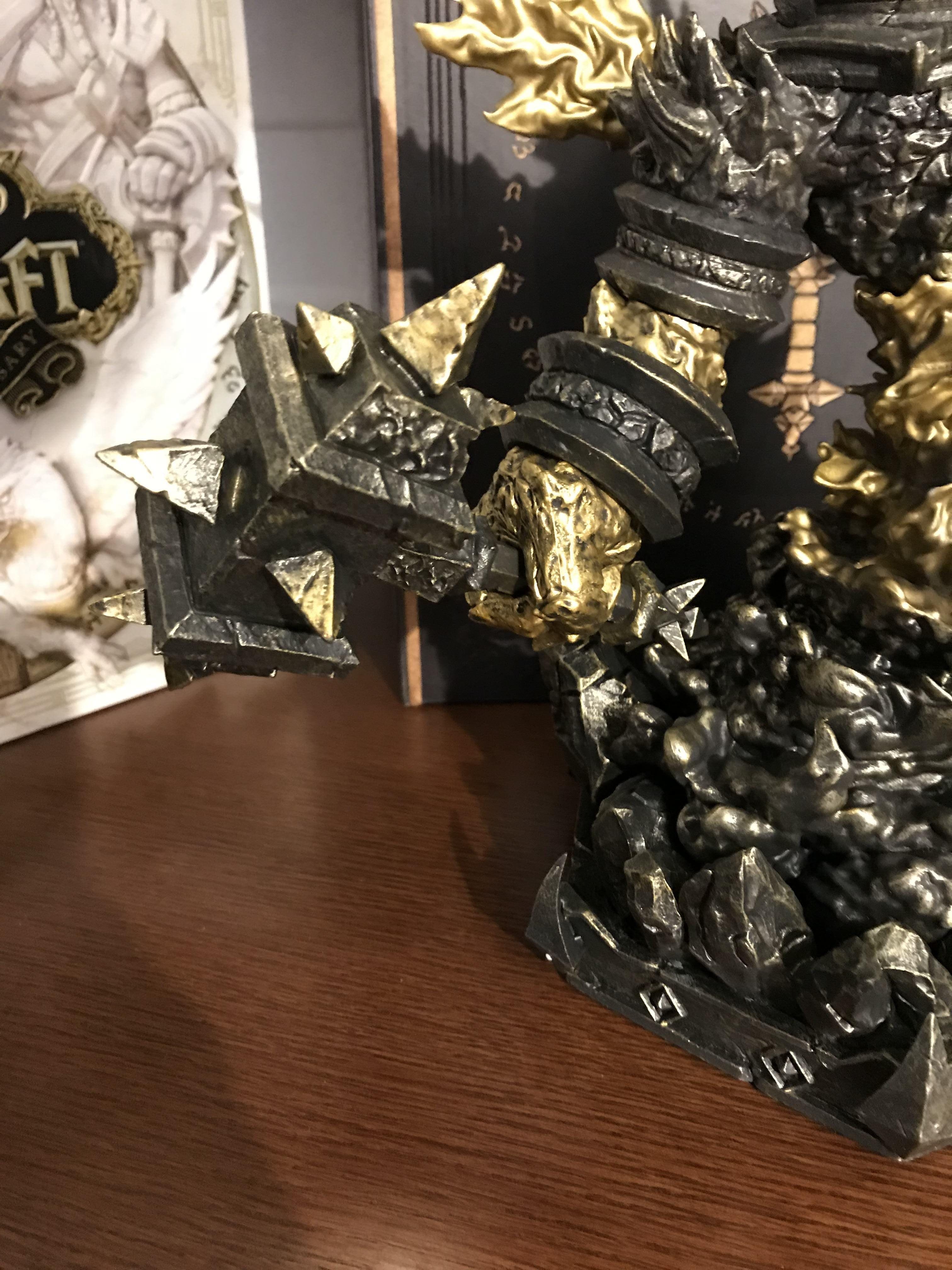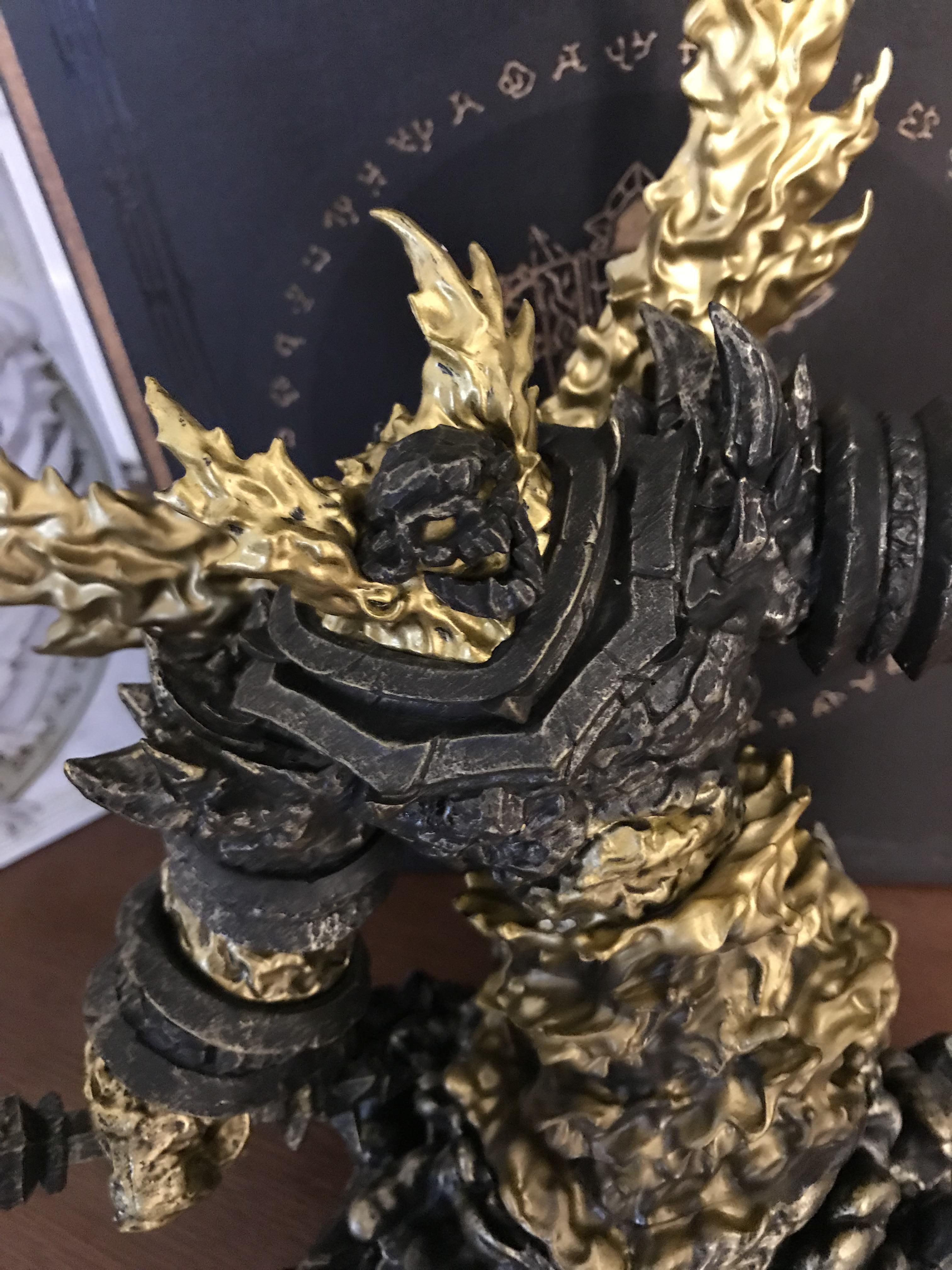 Ist die Statue jedoch mal zusammengebaut, sieht sie wirklich beeindruckend aus. Sie ist knapp 25cm hoch, und fühlt sich beim Berühren sehr hochwertig an. Das Material selbst ist auf der Verpackung leider nicht ersichtlich. Rein durch die Haptik würde ich hierbei auf eine spezielle Form von angenehm beschichtetem Plastik handelt. Laut Recherche soll es sich jedenfalls um biologisch abbaubare Rohstoffe handeln. Die Lackierung ist sehr gut gelungen, das Gold sticht bereits aus weiter Ferne hervor. Lediglich der Kopf des Feuerlords ist in meinen Augen etwas zu klein geraten – ist dieser sogar um einiges kleiner als die mächtig erhobene Hand des Elementarherren! Hier hätte Blizzard gerne einige Zentimeter mehr vergeben dürfen