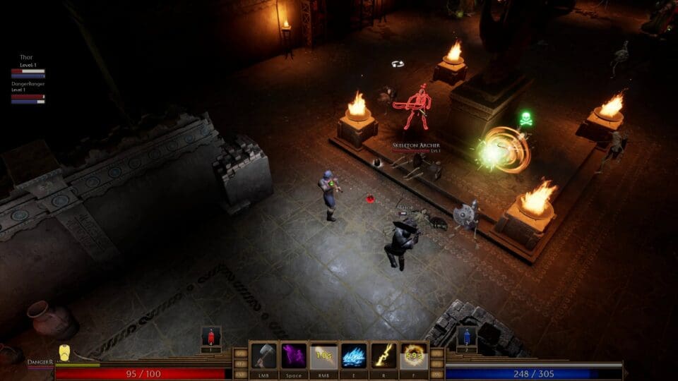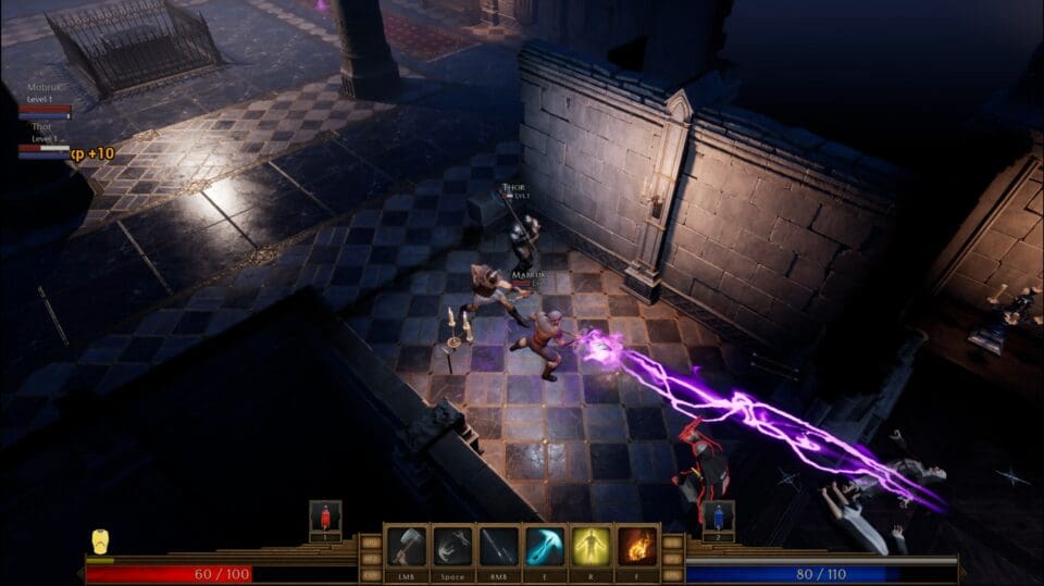 Die Steuerung erfolgt mit WASD, eure Blickrichtung kontrolliert ihr mit der Maus. Mit dem Mausrad könnt ihr zoomen oder die Ansicht um 360 Grad drehen. Mit der Strg-Taste könnt ihr euer Schild (falls ausgerüstet) verwenden und damit Schaden reduzieren, mit SPACE dasht ihr durch die Gegend (und zieht einen Feuerstreifen mit euch, in den Gegner gerne hineinlaufen und verbrennen). Am linken unteren Bildschirm seht ihr eure Lebensanzeige, rechts die Manaleiste. Ebenso seht ihr Stamina und Erfahrungsfortschritt und rechts oben eine Minikarte der nahen Umgebung. Gibt es eine gezielte Charakterentwicklung? Nicht so einfach, denn in Varthos – Heir to the Throne ist sehr Vieles vollkommen zufällig generiert, nicht nur die Dungeons und die Beute, sondern auch die Fähigkeiten. Eurer Charakter entwickelt sich, je nachdem, was ihr anzieht. Außerdem bekommt ihr bei einem Levelaufstieg Attributpunkte, die ihr auf bestimmte Eigenschaften verteilen könnt (Vitalität, Stärke, Geschicklichkeit, Intelligenz, Zähigkeit), um euren Charakter zu verbessern. Sterbt ihr, ist das alles wieder weg – ebenso wie das Inventar. Roguelite eben.