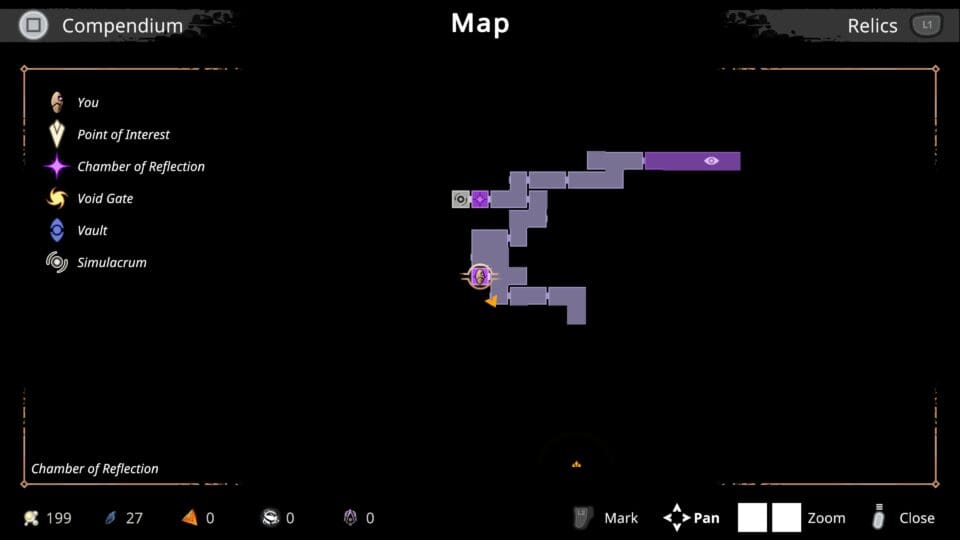 Anfangs können wir springen und mit unseren klauenartigen Händen zuschlagen. Kein Dash, kein Doppelsprung, kein Abrollen. Das (und vieles mehr) muss alles erst gelernt werden. Genretypisch müsst ihr euren Charakter kontinuierlich verbessern, um eine Chance gegen die (relativ bald respawnenden) Monster zu haben. Dafür könnt ihr Relikte und Seelen finden und ausrüsten. Sterbende Gegner hinterlassen oftmals Ichor, das Blut der Götter, oder auch andere Ressourcen. Eine Karte wird automatisch mit gezeichnet, außergewöhnliche Orte sind markiert.