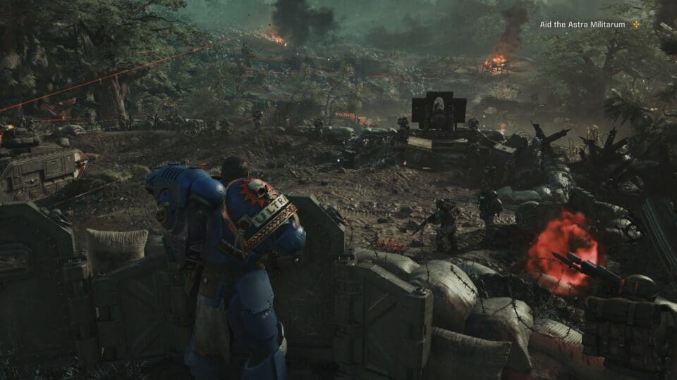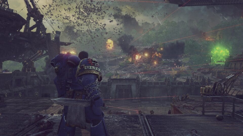 Und wenn ich sage Gegnermassen, dann meine ich wirklich Gegnermassen. Ich habe noch nie ein Spiel gesehen, bei dem der Kampf gegen Massen an Gegnern derart realistisch dargestellt wird. Der eigentliche Kampf gegen eine Vielzahl von Gegnern kommt ja bei einer Menge der typischen Horde-Attack Spiele vor, die seit dem Erscheinen von Left 4 Dead erschienen sind. Der Unterschied bei Warhammer 40,000: Space Marine 2 ist jedoch der, dass das Gemetzel hier meistens in riesige Schlachten eingebunden ist. Wir kämpfen nicht nur gegen Gegner im Nahkampf, sondern die Gegner sind überall – soweit das Auge reicht. Und wir kämpfen auch nicht alleine – und damit meine ich nicht unser Team, das direkt mit uns kämpft, sondern damit meine ich unzählige menschliche Soldaten, die ebenfalls auf unserer Seite kämpfen. Wenn sie sehen, dass sie Seite an Seite mit den legendären Space Marines kämpfen dürfen, steigt ihre Moral gleich dramatisch. Viele der Schlachten in Warhammer 40,000: Space Marine 2 sind schlichtweg episch.