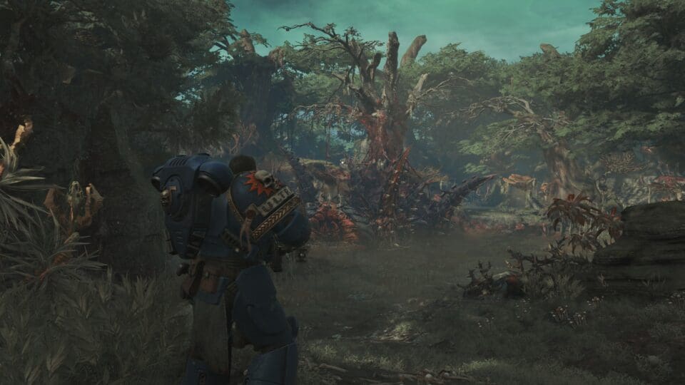 In Warhammer 40,000: Space Marine 2 spielen wir wieder Demetrian Titus. Titus ist ein Space Marine – sein einziger Lebenszweck besteht darin, als genetisch verbesserter Supersoldat die Menschheit gegen die vielen Feinde des Imperiums zu verteidigen. Rund 200 Jahre nach der Geschichte des ersten Teiles (Space Marines haben eine hohe Lebenserwartung…) wird Titus und sein Team auf einen Planeten geschickt, der gerade von den Tyraniden überfallen wird. Im heldenhaften Kampf geht zwar das gesamte Team drauf, das Missionsziel wird aber erreicht. Titus wird gerettet und von der Kunst der imperialen Ärzte wieder zusammengeflickt. Vom Captain zum Leutnant degradiert, erhält er sofort wieder ein Kommando und wird auf den Planeten zurück geschickt, um mit einem neuen Team von Space Marines gegen die Tyraniden zu kämpfen. Die Verteidiger des Planeten sind von den Massen an angreifenden Aliens überrannt worden und haben trotz heldenhaften Kampf die Kontrolle über die riesigen Orbitalgeschütze verloren, die den Orbit des Planeten von den Tyraniden säubern können. Also müssen wir die Geschütze zurück erobern. Und so beginnt das Spiel…