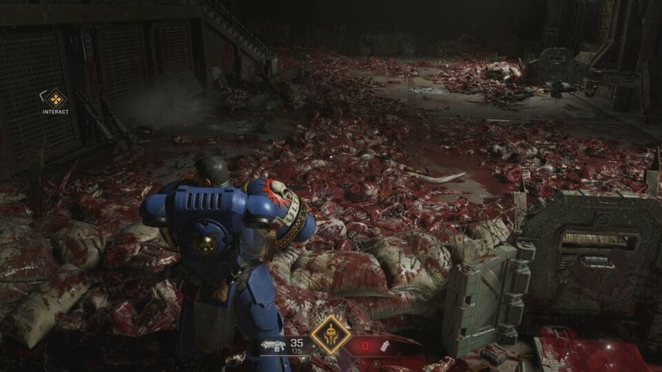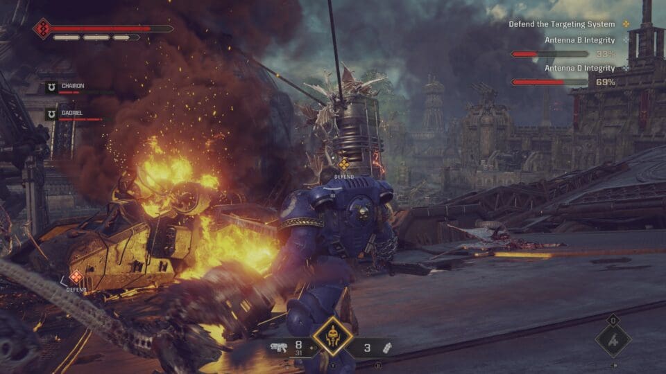 Unsere Kollegen (die beiden Space Marines Chairon und Gadriel) stehen uns im Regelfall zur Seite, entweder als Bots oder als zwei menschliche Mitspieler, wenn ihr das Spiel mit Freunden angeht. Jeder der drei Helden hat eine eigene Superfähigkeit – Titus kann „Righteous Fury“ einsetzen, wodurch er mehr Schaden verursacht und sich ein wenig heilt. Chairon markiert Gegner und macht sie dadurch schwächer, während Gadriel mit seinem Schlachtruf in den Berserkermodus wechselt. Diese Fähigkeiten stehen allerdings nicht allzu oft zur Verfügung. Wenn ihr schwer verletzt werdet, können euch eure Kameraden wiederbeleben, zumindest ein paar Mal. Danach bleibt ihr irgendwann tot und die Mission ist verloren. Allerdings müsst ihr die doch recht langen Missionen nicht ganz von vorne wieder beginnen, sondern macht beim letzten automatischen Speicherpunkt weiter.