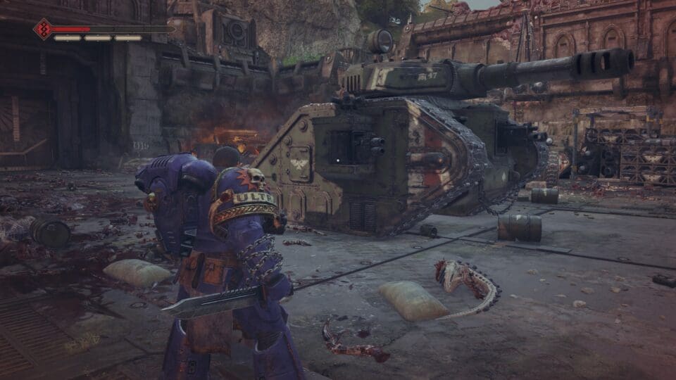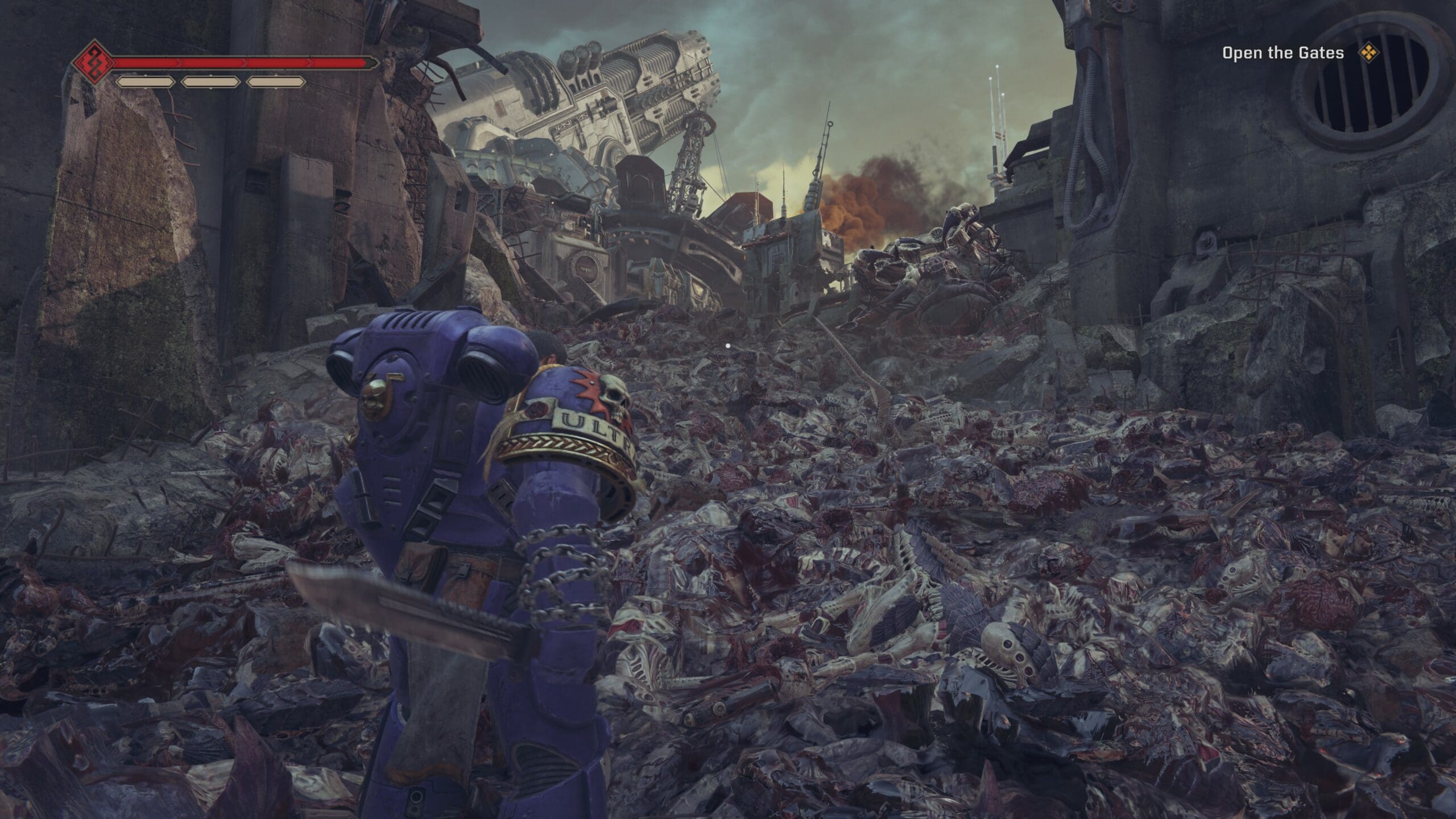 Seite an Seite mit den menschlichen Truppen des Planeten kämpfen wir uns voran, während Massen an Tyraniden auf uns einströmen. Da helfen nicht einmal die Kanonen und Panzer unserer Verbündeten. Die Luftwaffe ist ganz effektiv, aber viel zu selten verfügbar. Die wesentlichen Missionsziele müssen wir natürlich in Handarbeit erledigen. Bewaffnet mit einer Nahkampfwaffe wie einem Kettensägeschwert (oder vergleichbaren Mörderwaffen) und einem Bolter (manchmal mit integriertem Granatwerfer) für den Fernkampf, dazu ein paar Handgranaten und Stimpacks zur Heilung werfen wir uns in den Kampf. Zuschlagen, ausweichen, parieren, betäubte große Gegner mit brutalen Exekutionen in ihre Einzelteile zerschnippeln oder mit dem Bolter abknallen… das ist über weite Strecken die Hauptspielmechanik. Ihr bekämpft eure Feinde in einer Mischung aus Nah- und Fernkampf aus der dritten Person, wobei jede Waffe eigene Combos erlaubt. Die Feinde sind die Tyraniden – eine Rasse aus mechanischen Teilen und Biomaterial, die in gigantischen Schwärmen über den Planeten hergefallen sind. Der ganze Schwarm wird von einer zentralen Intelligenz kontrolliert. Die einzelnen Tyraniden sind absolut todesverachtend – und ein klein wenig dämlich. Durch die zentrale Kontrolle werden die Horden aber immer auf strategisch bedeutsame Ziele gelenkt, sodass die Tyraniden insgesamt recht erfolgreich vorgehen. Aufgrund der gigantischen Anzahl ist es ziemlich egal, wenn einzelne Krieger verloren gehen. In vielen Szenarien ist das gesamte Schlachtfeld großflächig mit zerfetzen Tyraniden bedeckt, oder ihr klettert über Berge von toten Tyraniden, um voranzukommen.
