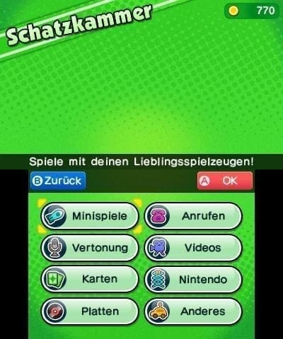 Der letzte neue Punkt im Menü sind schließlich die Souvenirs. Wie vorhin schon angesprochen, erhaltet ihr im Story-Modus für abgeschlossene Kapitel Gold – genau wie für andere Errungenschaften: Erfüllte Missionen, erzielte Richtwerte oder Rematches im Story-Modus bringen euch allesamt Reichtümer ein. Für je 600 Gold könnt ihr dann unter Souvenirs an der Pachinko-Maschine drehen und so per Zufallsprinzip Neues für eure Schatzkammer ergattern. Zu den so erworbenen Schätzen zählen Minispiele nach ähnlichem Prinzip wie die Microgames genauso wie Soundtrack-Schnipsel, Einträge im Nintendo-Almanach, der euch über bekannte sowie weniger bekannte Nintendo-Geräte aus der Geschichte des Entwicklers informiert, oder sogar die Möglichkeit, zum Spaß mittels Mikrofon neue Tonspuren für die Story-Cutscenes eurer liebsten Charaktere aufzunehmen.