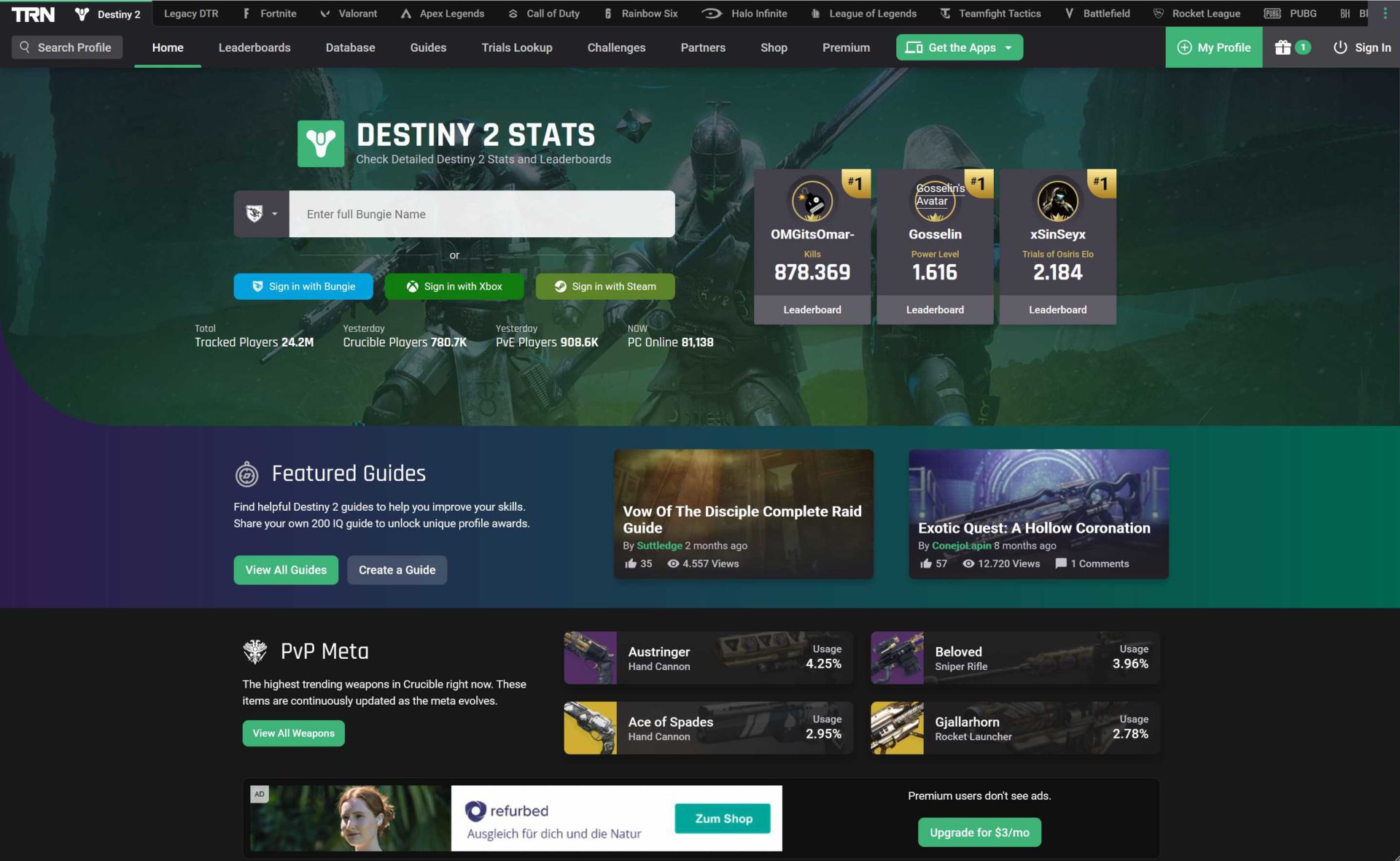 Die dritte und letzte Seite, die wir Destiny 2-Spieler:innen empfehlen möchten, ist DestinyTracker. Die Website bietet alles, was ihr benötigt um eurer Spiel zu verbessern, inkl. umfassender Anleitungen. Darüber hinaus gibt es auch eine Seite mit Ranglisten, anhand derer ihr euch einen Überblick verschaffen könnt, welche Spieler:innen derzeit an der Spitze sind.