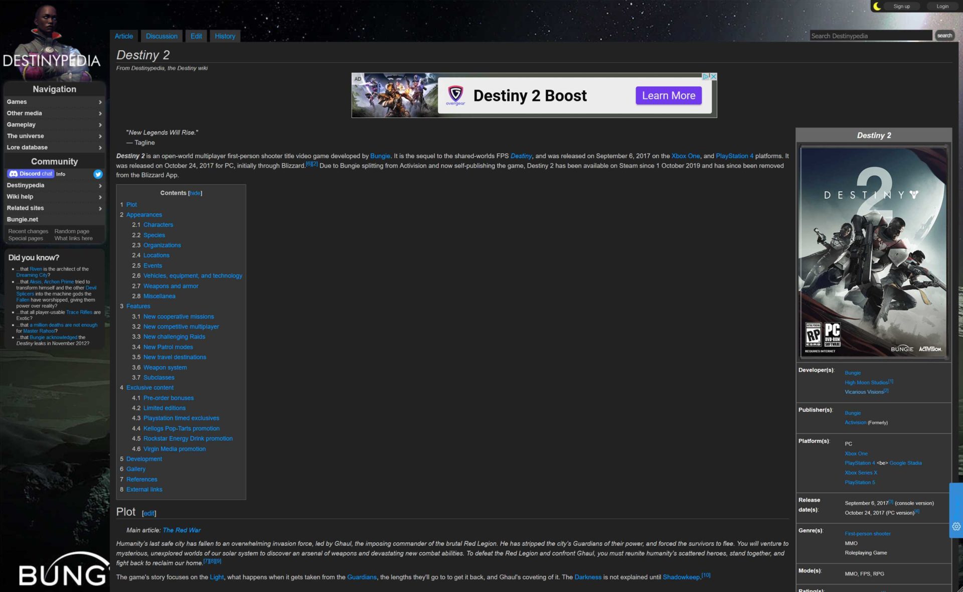 Die erste Website, die wir in unserer Liste erwähnen möchten, ist Destinypedia. Stellt euch diese Website als die Wikipedia von Destiny vor, da sie alles enthält, was mit dem ersten Spiel und der Fortsetzung zu tun hat. Destiny 2-Spieler:innen können viel von dieser Seite profitieren, da sie helfen kann, schnell alles Wichtige zu lernen. Es gibt es eine spezielle Seite für Destiny 2, auf der alle wichtigen Informationen zu dem Spiel gesammelt wurden. Weitere Unterrubriken informieren z.B. über alle Waffen im Spiel und geben euch Auskunft über die Magazingröße, Feuerrate oder wie ihr überhaupt zu einer bestimmten Waffe kommt.