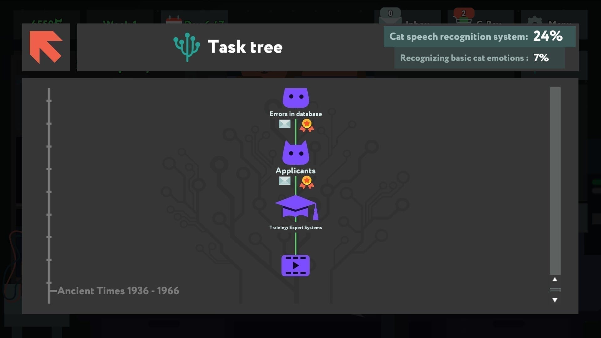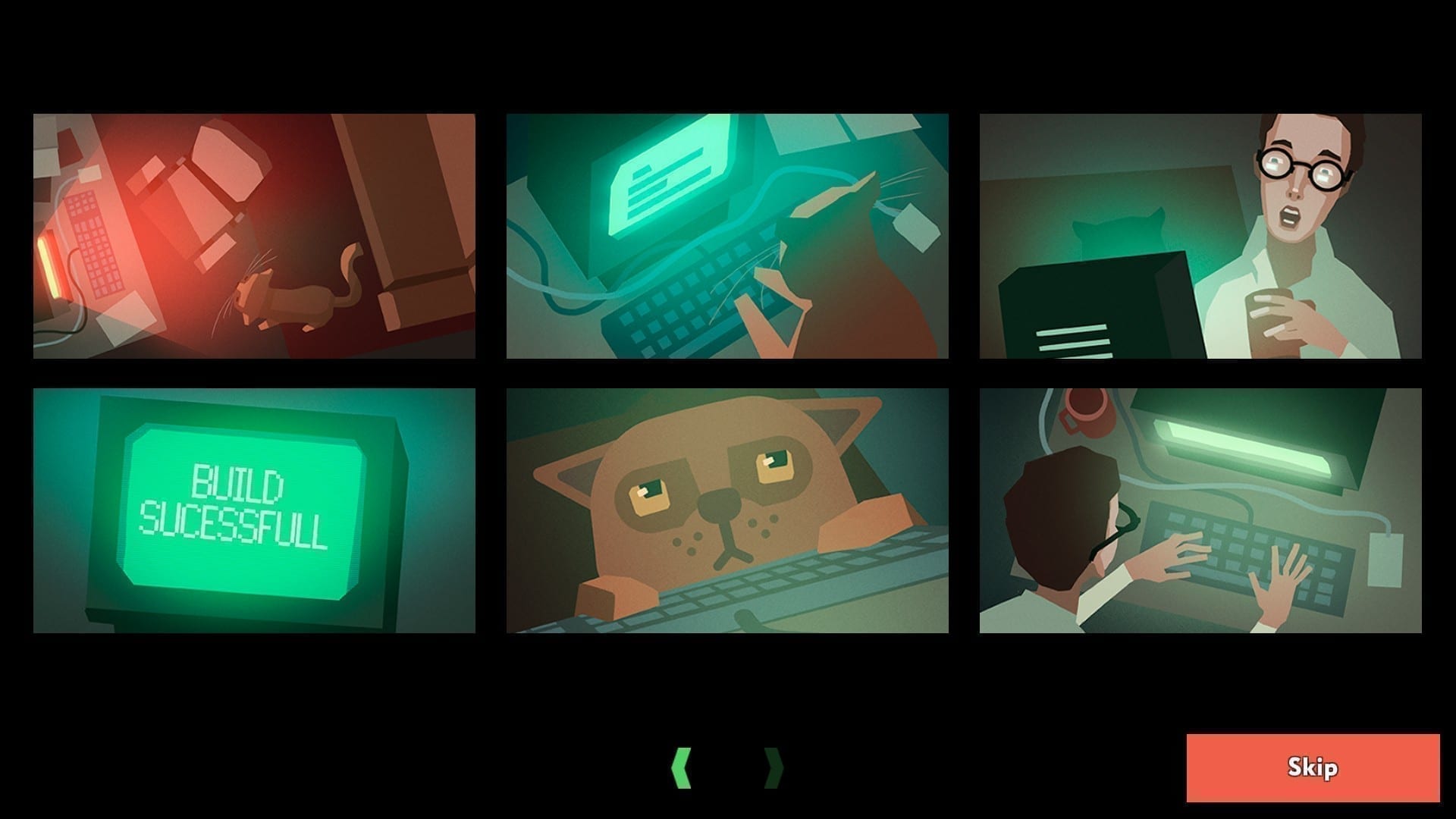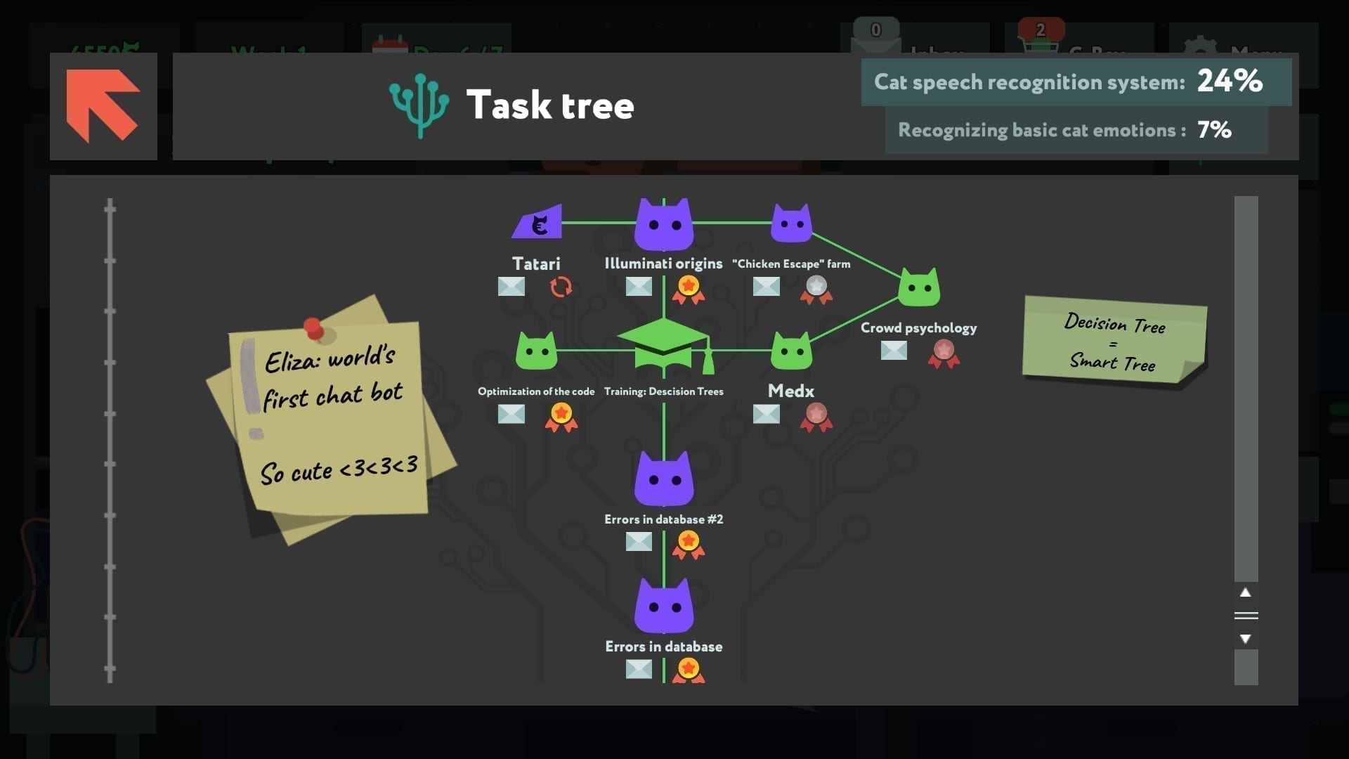 Wie schon erwähnt ist unser Ziel in while True: learn(), ein fiktives Machinelearning-Programm, zur Entschlüsselung der Katzensprache fertig zu stellen, doch wie erreichen wir dies? Ihr durchlebt die Karriere eines Entwicklers. Dabei setzt ihr euch immer Meilensteine, die das Ende des aktuellen Karriereabschnitts darstellen und euch dem Ziel, eure Katze zu verstehen, immer näherbringt. Euer erster Meilenstein, der Computer muss erkennen, dass die Katze überhaupt davor sitzt. Um den gesetzte Vorhaben zu erreichen, gibt es immer eine zentrale Funktion, um die sich die aktuelle Entwicklung dreht. Diese Funktionen sind natürlich stark vereinfacht und es muss jedem klar sein, dass er sich nach diesem Spiel nicht einfach hinsetzen und wild drauf los Programmieren kann, trotzdem vermittelt einem das Spiel jede Menge Grundbegriffe und Methoden, wie man Software herstellt. Ähnlich wie in einem Rollenspiel, könnt ihr die Story geradlinig durcharbeiten, in dem ihr alle Hauptaufgaben, die in Form von Aufträgen und Selbststudium zu euch kommt, absolviert. Es gibt aber auch Nebenaufgaben, die zwar nicht gelöst werden müssen, um einen Fortschritt im Spiel zu generieren, aber neben der persönlichen Herausforderung, hat es noch ein paar Vorteile. Dazu später mehr.