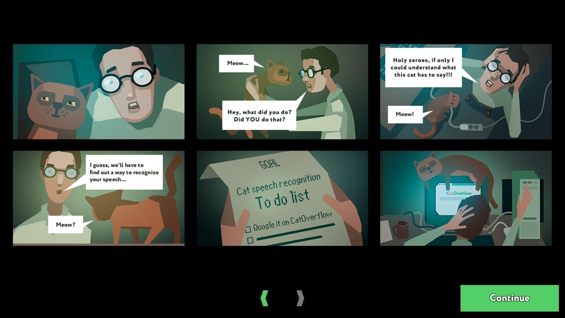 Aber alles schön der Reihe nach. In while True: learn() seid ihr ein Entwickler, der gerade eines seiner Programme nach Fehler durchsucht – kurz er debuggt es. Leider erzielt ihr damit keine Fortschritte und so entfernt ihr euch vom PC und macht eine Pause. Ein folgenschwerer Handlung, denn eure Katze begibt sich an euren Rechner und berichtigt das Programm in Rekordzeit. Voll der Begeisterung versucht ihr mit der Mieze zu sprechen und herauszufinden, wie sie das geschafft hat. Doch wie alle Katzenbesitzer mir sicherlich zustimmen werden, so richtig versteht man das Miauen nicht. Daraufhin beschließt ihr einen Übersetzer zu entwickeln, nur so gut sind eure Fähigkeiten noch nicht und so beginnt ihr euch Schritt für Schritt alle notwendigen Fähigkeiten anzueignen.