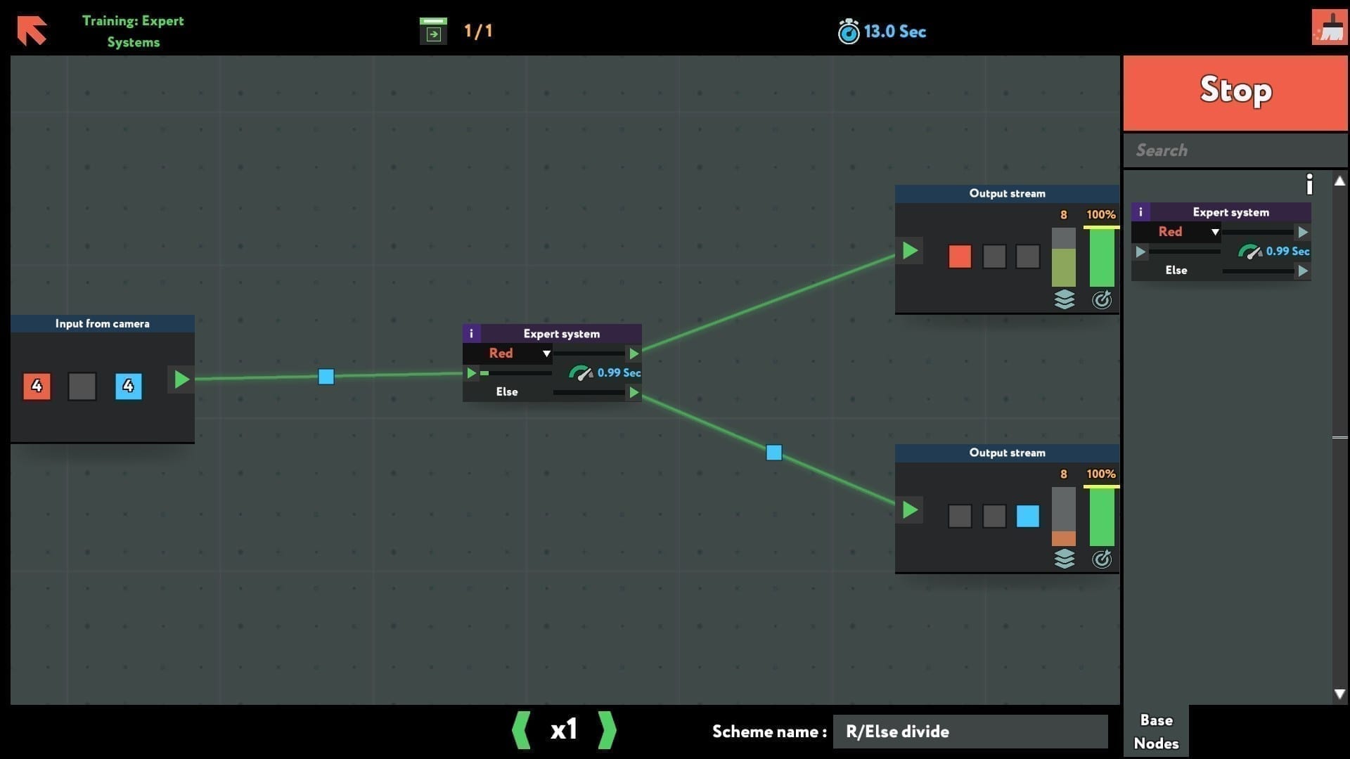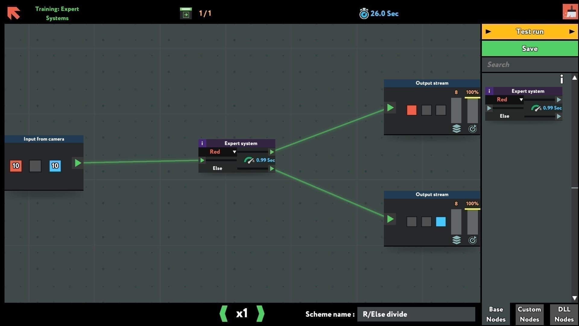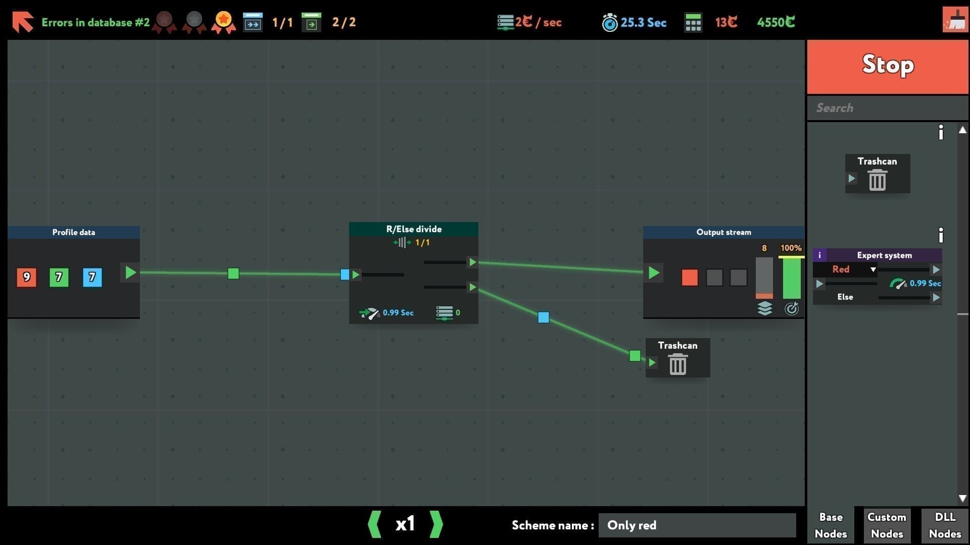 Unsere erste Aufgabe ist es rote und blaue Vierecke der Eingabe, zu separieren und diese zur richtigen Ausgabe zu bringen. Um dies zu tun, ziehen wir nun eine Funktion auf die Arbeitsfläche und passen diese genau so an, damit unsere Aufgabe erfüllt wird und verbinden sie mit der Eingabe beziehungsweise der Ausgabe. Schon können wir einen Testlauf starten und wenn wir mit dem Ergebnis zufrieden sind, können wir die Software gleich releasen. Aber Vorsicht der Teufel steckt wie immer im Detail, denn jede Aufgabe hat ein Limit wie viele Funktionen ihr verwenden dürft, wie viele Fehler euer Programm machen darf und als ob das nicht genug wäre, darf euer Programm nicht zu lange brauchen um abgearbeitet zu werden. Die Durchlaufzeit könnt ihr mit euren genutzten Funktionen steuern, doch Vorsicht: Funktionen mit schnellen Arbeitsgeschwindigkeiten haben auch eine höhere Fehleranfälligkeit. Das alles muss nun unter einen Hut gebracht werden und schon wächst das Verständnis für einen Entwickler, warum manchmal so viele Bugs in Spielen oder Software zu finden sind. Jedes eurer Programme wird bewertet und erhält einen Gold-, Silber- oder Bronze-Status – die Bewertung ist jedoch nur für die aktuelle Aufgabe. Es kommt immer wieder vor, dass ihr euer eigenes Programm, welches ihr zwei Aufgaben zuvor entwickelt habt, weiter verbessern oder von Fehlern befreien müsst, da der Kunde eine bessere Software wünscht. So kämpft ihr euch durch immer komplexer werdende Logik-Puzzle und erfährt am eigenen Leib, wie hart der Job des Entwicklers oft ist.