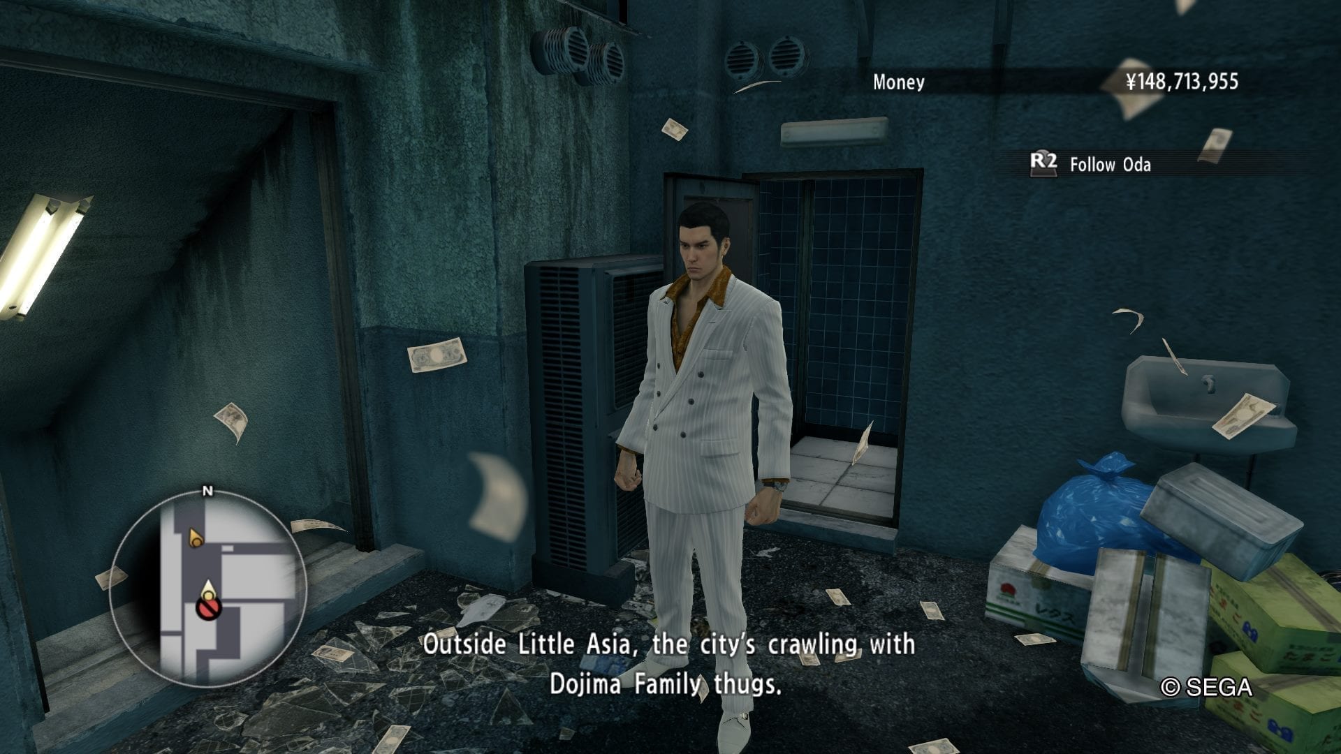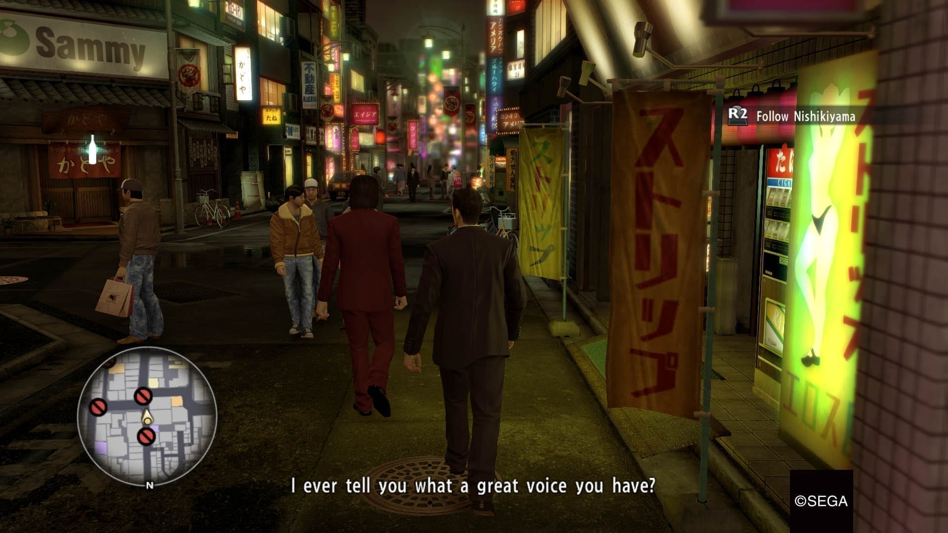 Hilfe bekommt er dabei von unerwarteter Seite. Der von seinem eigenen Clan ausgestoßene Nachtclub-Manager Goro Majima hat seine ganz eigenen Motivation hinter die Machenschaften rund um das leere Stück Grund mitten im dicht bebauten Stadtteil Kamurocho, um das sich alles zu drehen scheint. Und so wechselt die Perspektive des Spielers im Laufe der Handlung zwischen diesen beiden Männern hin und her und lässt uns so langsam dem Kern des Pudels näherkommen.